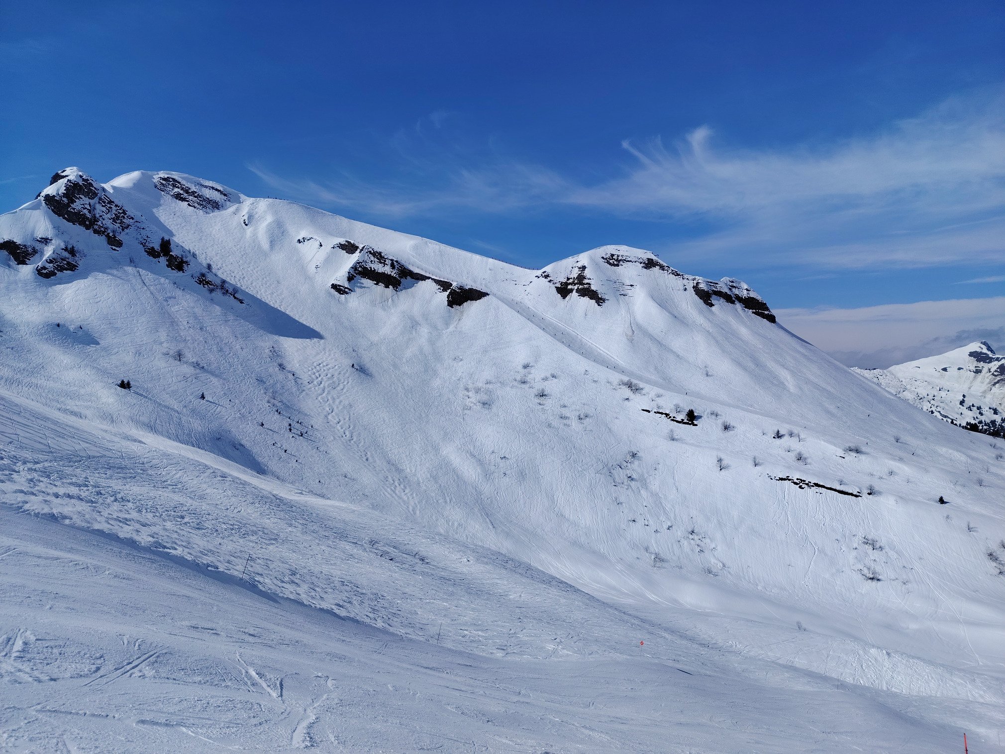 Arrivé 8h30 pour pas galerer à trouver de la place, l'ouverture des pistes est pas emballante: regel massif des pistes, jour blanc et un dammage pas top par endroits...autant dire que l'échauffement a piqué un peu. Puis rapidement le grand soleil à réchauffé nos cœurs et les pistes. Globalement 5h de ski avec un rendement honnête de 10000d-. Peu d'attente au remontées et zéro attente a partir de 12h.