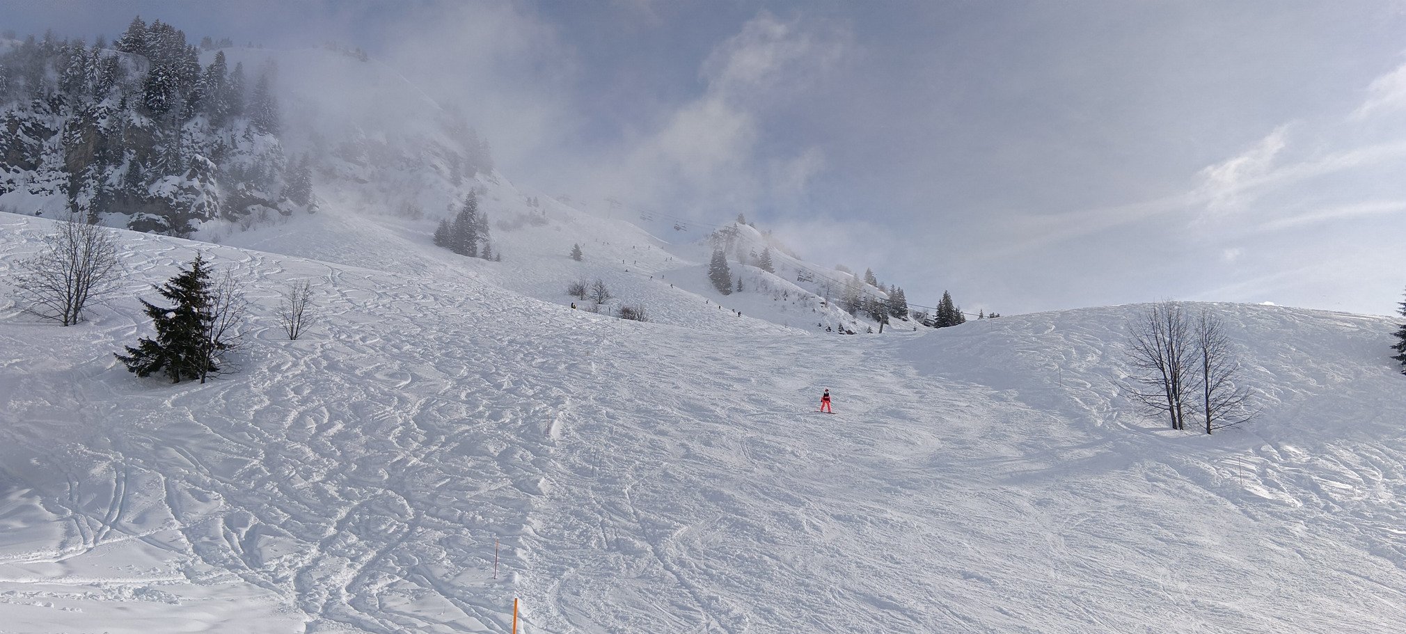 Niveau neige, c'était pas ouf globalement. Il a dû pleuvoir haut, car la neige était bien humide. Sur piste, le matin surtout, c'était une neige assez bùtarde, ni fraßche, ni printemps, un peu savonneuse. Alors c'est toujours moins pire que le carrelage, mais bon... Heureusement, en se réchauffant un peu au fil de la journée, elle a davantage tendu vers la soupe, et c'était du coup nettement plus agréable à skier.