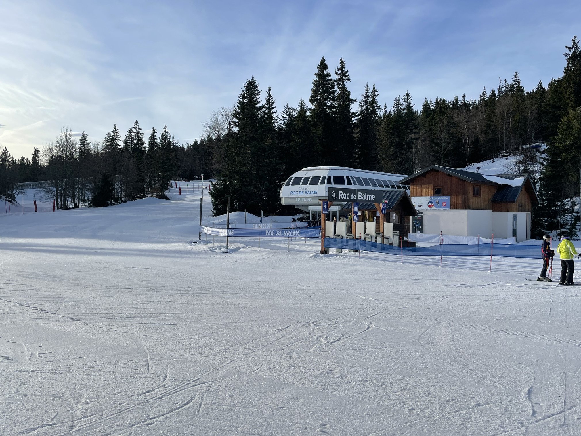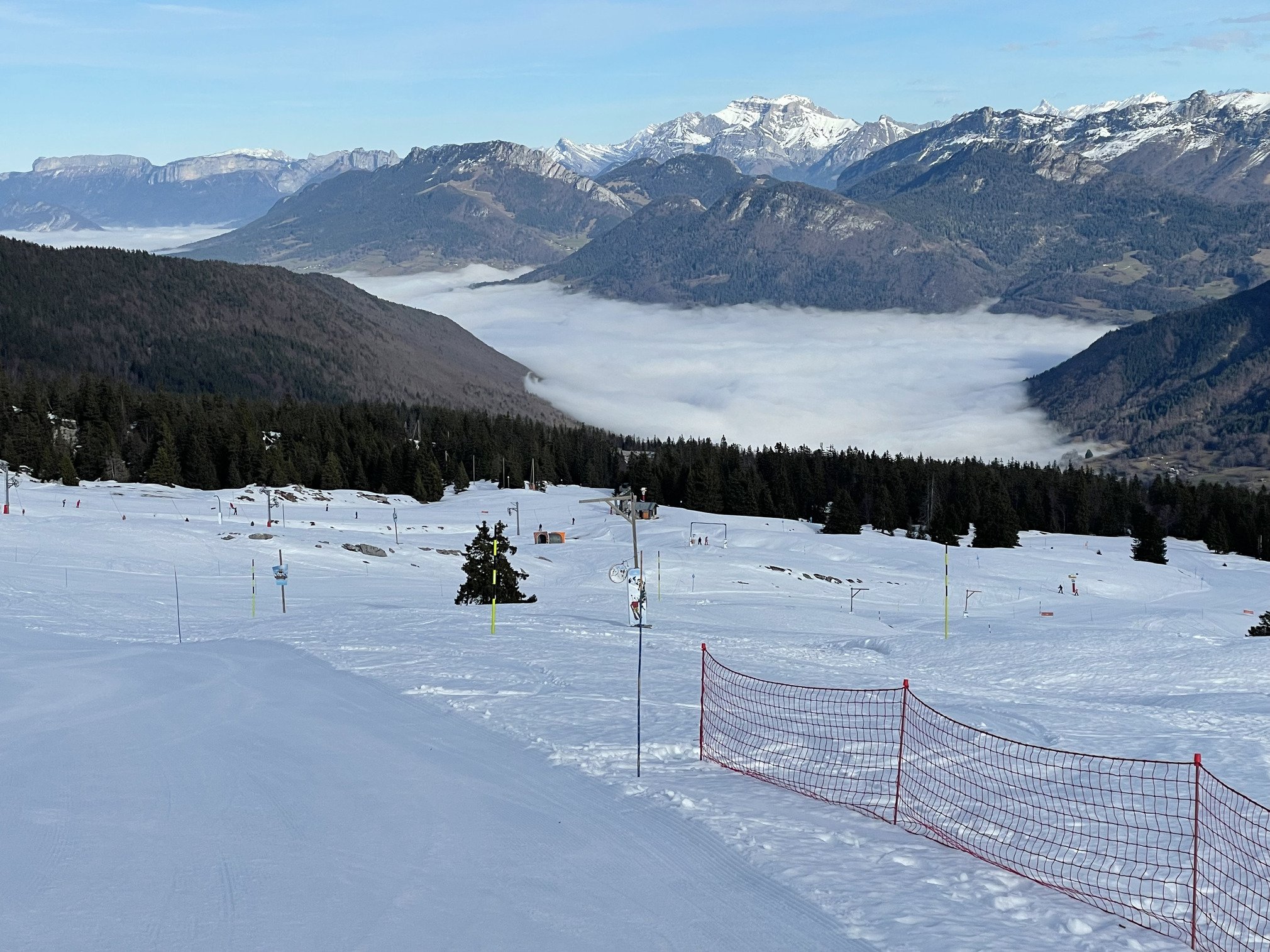 Sceptique sur le fait qu’on sorte de la brume et sur les conditions vu le faible enneigement et n’ayant pas le courage de me lever tôt, force est de constater à notre arrivée qu’on est bien au-dessus de la couche nuageuse… et qu’il y a très peu de monde.