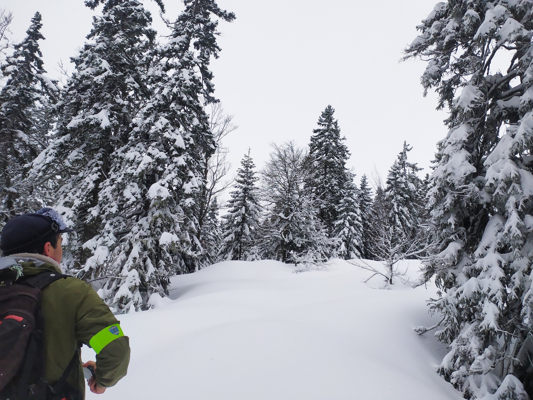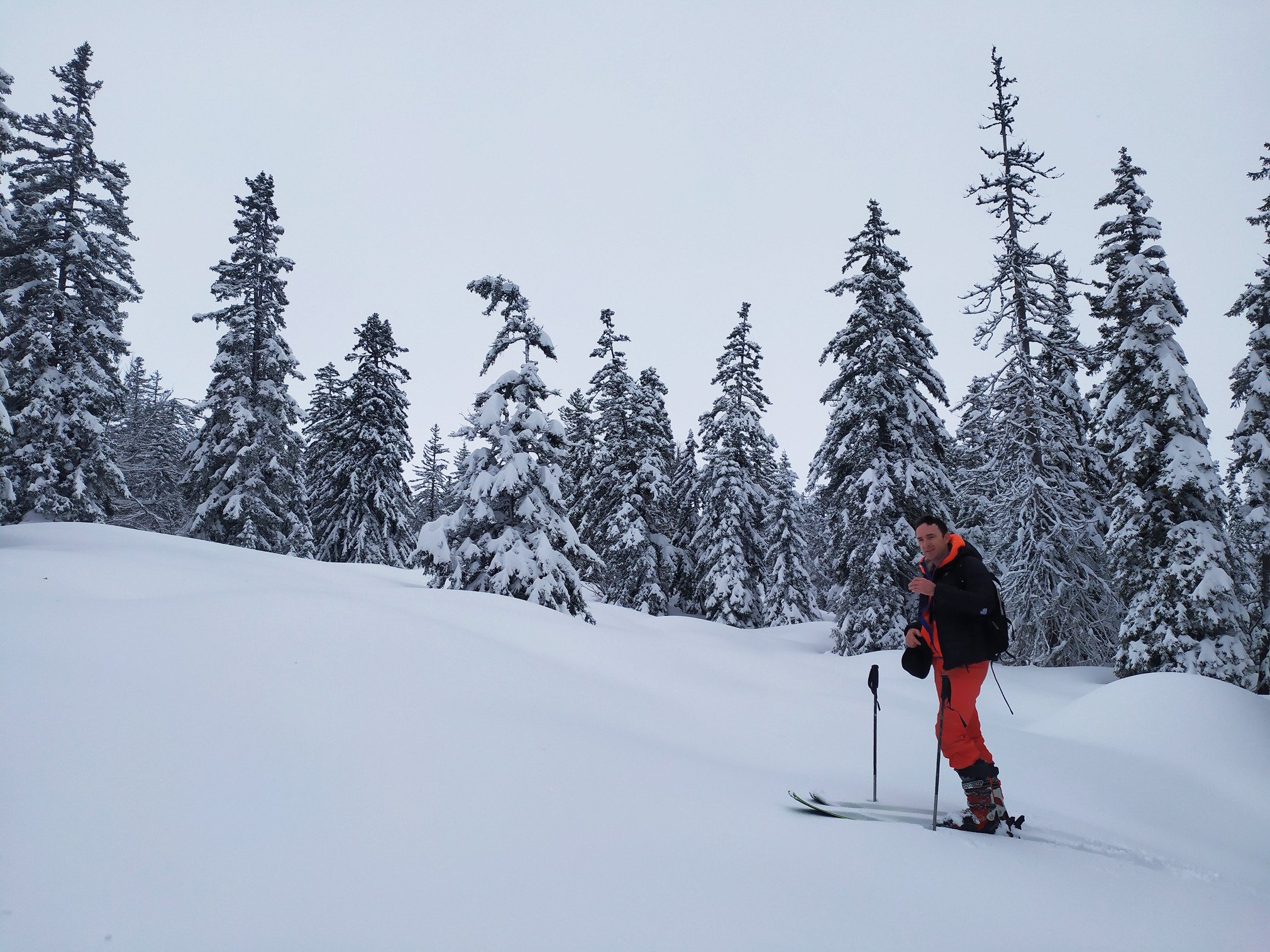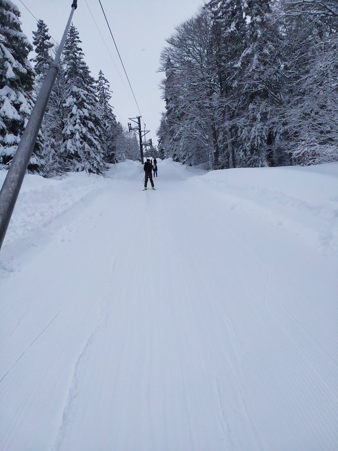 le soleil ne percera finalement jamais, et le vent et la neige en revanche auront raison de notre patience. on redescend sur une neige quali sur les pistes, et de la fraiche legere sur bord de piste. la visibilité est meilleure en front de neige où les nuages ne stagnent pas.
