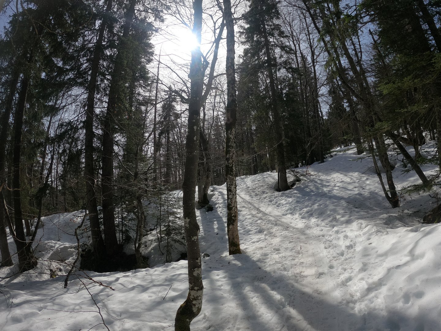 Nous montons sagement par la trace des "crêtes" : belle couche légèrement soupienne sous les sapins, rien ne dépasse, pas d'herbe, pas de souche, pas de requins. Excellentes conditions ... mais pas mal de monde.