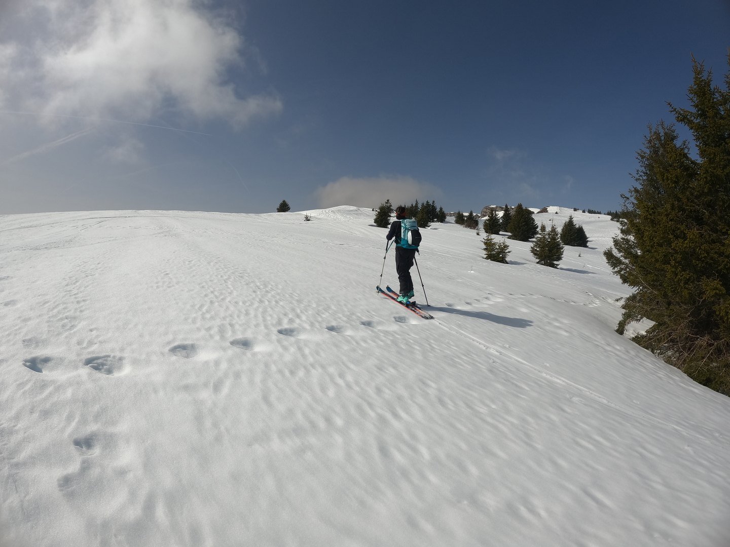 En sortant de la foret, nous bifurquons sur la gauche à travers les "alpages" pour nous éloigner des pistes et des gens sur la trace : les photos parlent d'elles-mêmes.