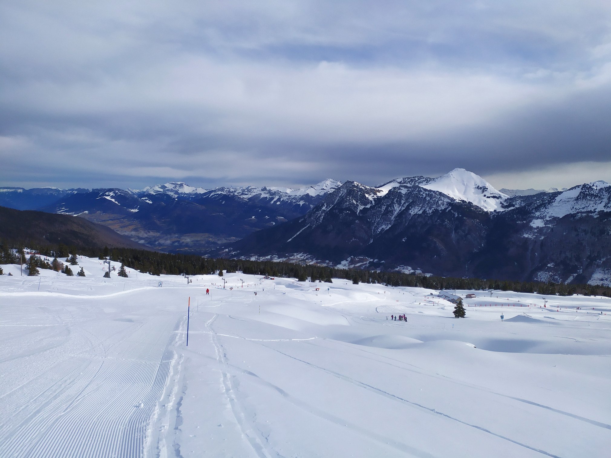 -les plus : tres chouette amenagement le long du tapis couvert de Karst et le monde souterrain avec des petites boxes un park ludique, pic 2. l acces est pratique depuis le front de neige. Il reste de la neige sur les sapins dans le secteur du Teleski des Biolles. Et enfin toujours cette belle vue sur le Mont Colombier.