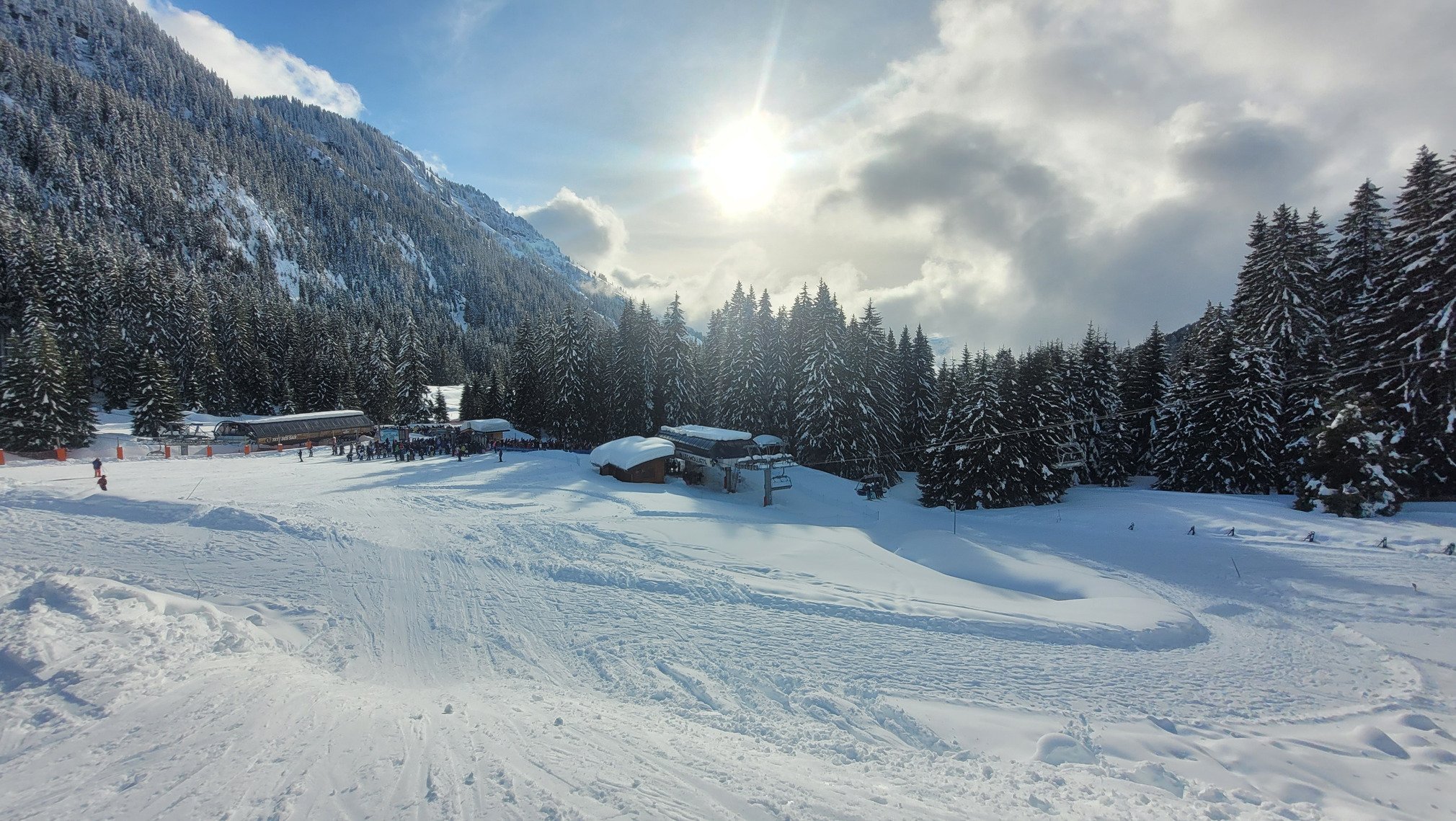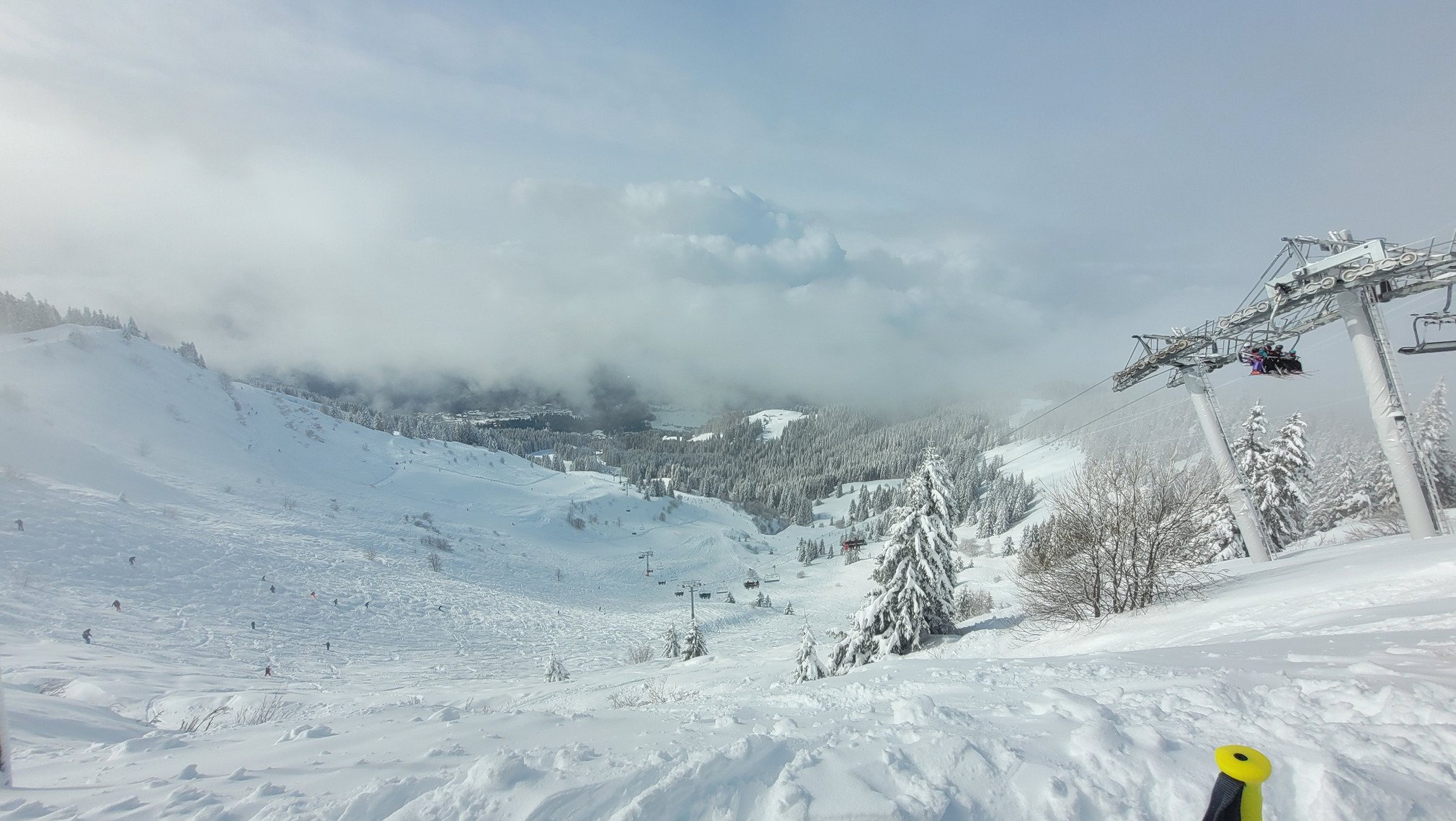 Pas le temps de niaiser ce matin!!! A 8h40 au départ de la Kédeuse, ça trace sous le télésiège des Molliets 2 ou 3 fois en attendant l ouverture de Tête des Saix, et là c est parti pour Corbalanche, dans les bois, Pacoty, sous Coulouvrier, sois Gron, en travers de la Silice... y a trop d'neige!!!! plus ou moins lourde selon l altitude mais toujours à foison!!! D ailleurs j me demande où sont passés les gens....ça s éclairci un peu en début d aprèm pour finalement laissé apparaître un beau ciel bleu ensoleillé pour le reste de l aprèm. Dernière descente, et là trop de monde à mon goût aux Molliets, j décide de rentrer par la Sarbotte!! Un ancienne piste verte qui partait des Molliets et rejoinait les Carroz sur le bas des Timalets. Mauvaise décision, avec toute cette neige j peine à retrouver sa trace, j descends trop bas, obligé de remonter à pied la pente avec 1,20m de neige 😵💫. Bref une journée dantesque où j ai perdu mes cuisses, mes abdos et ma gourde 😅