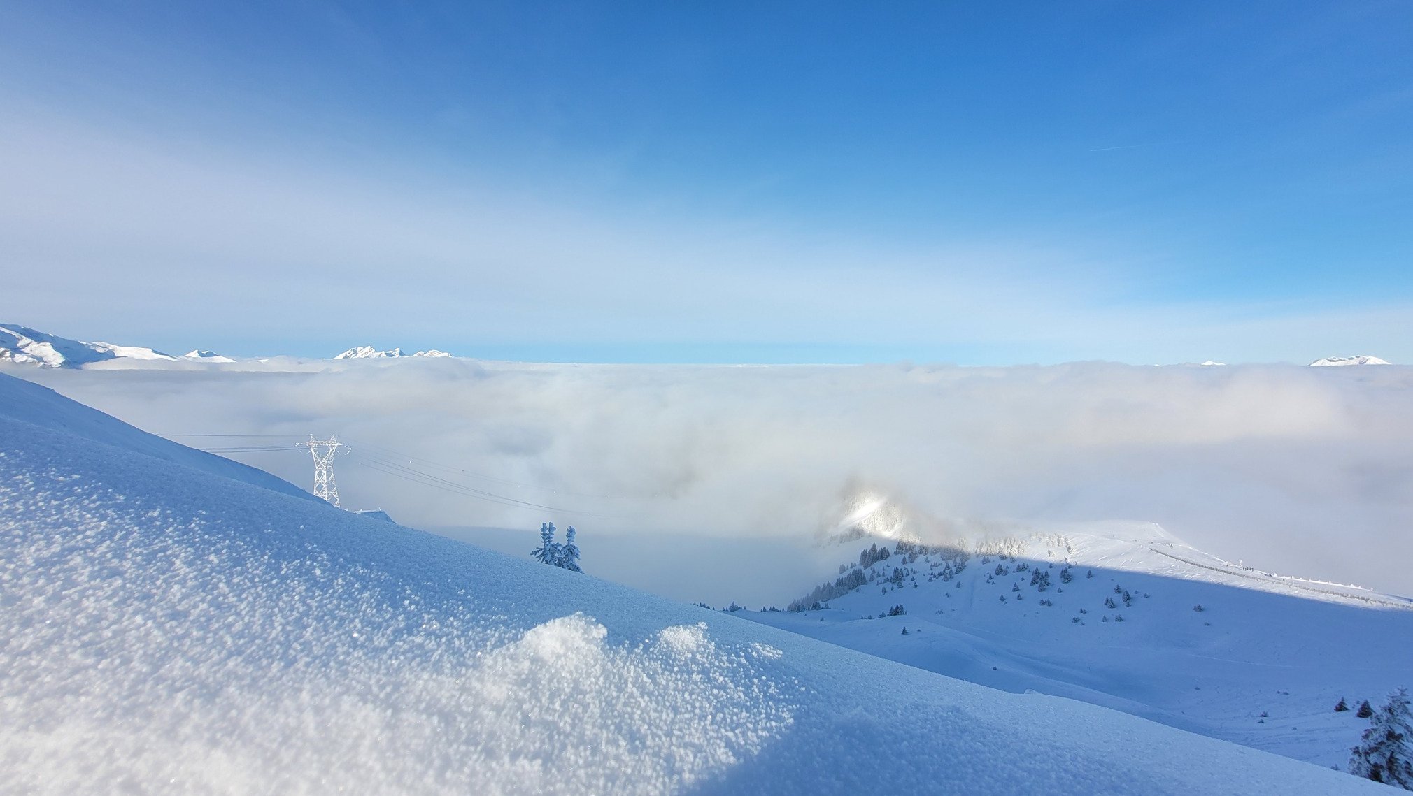 On traverse qq nuages par moment, ce qui réduit la visibilité mais on la retrouve très rapidement. Un peu de monde par endroit, mais pas de queue aux remontées.