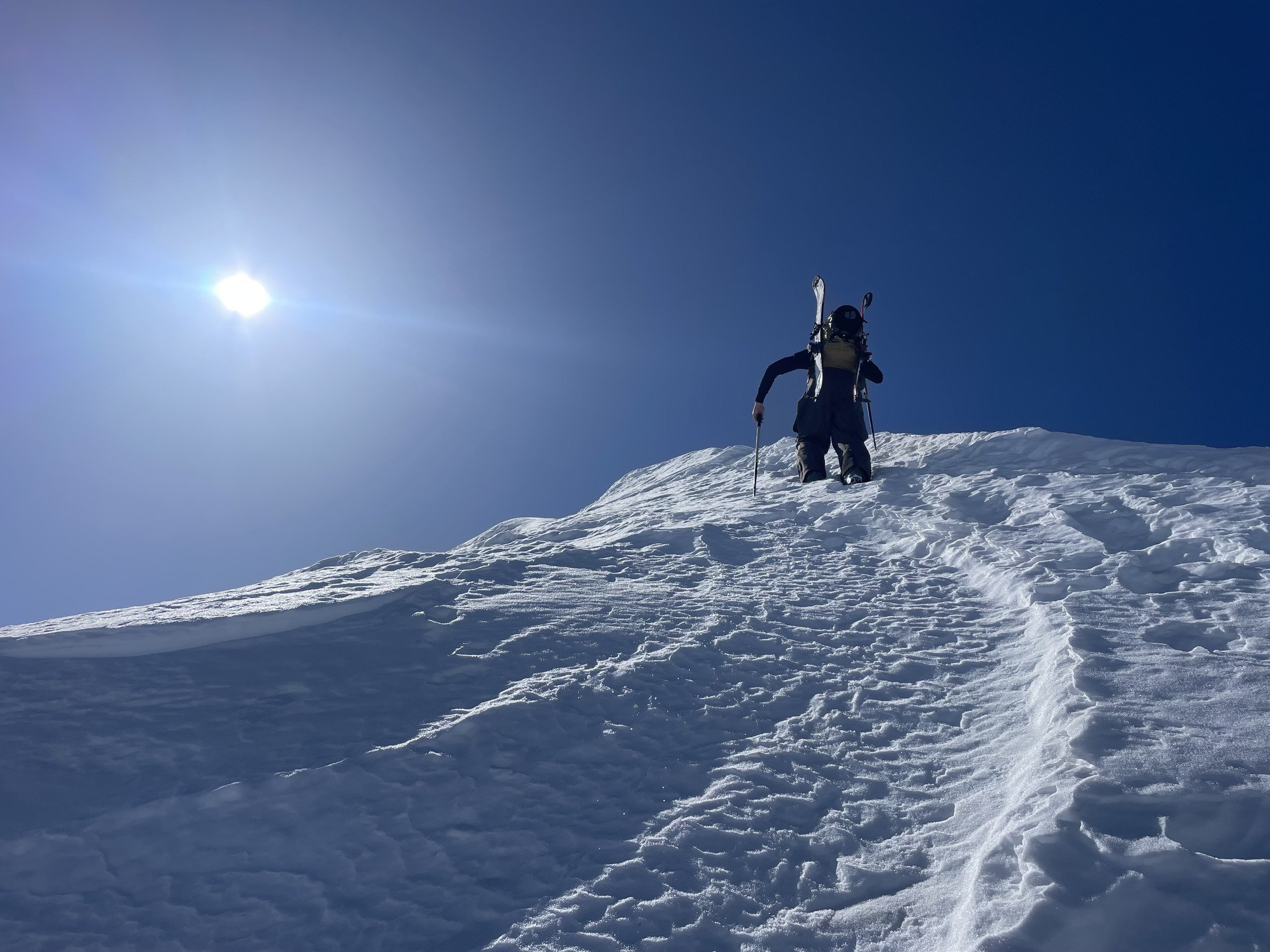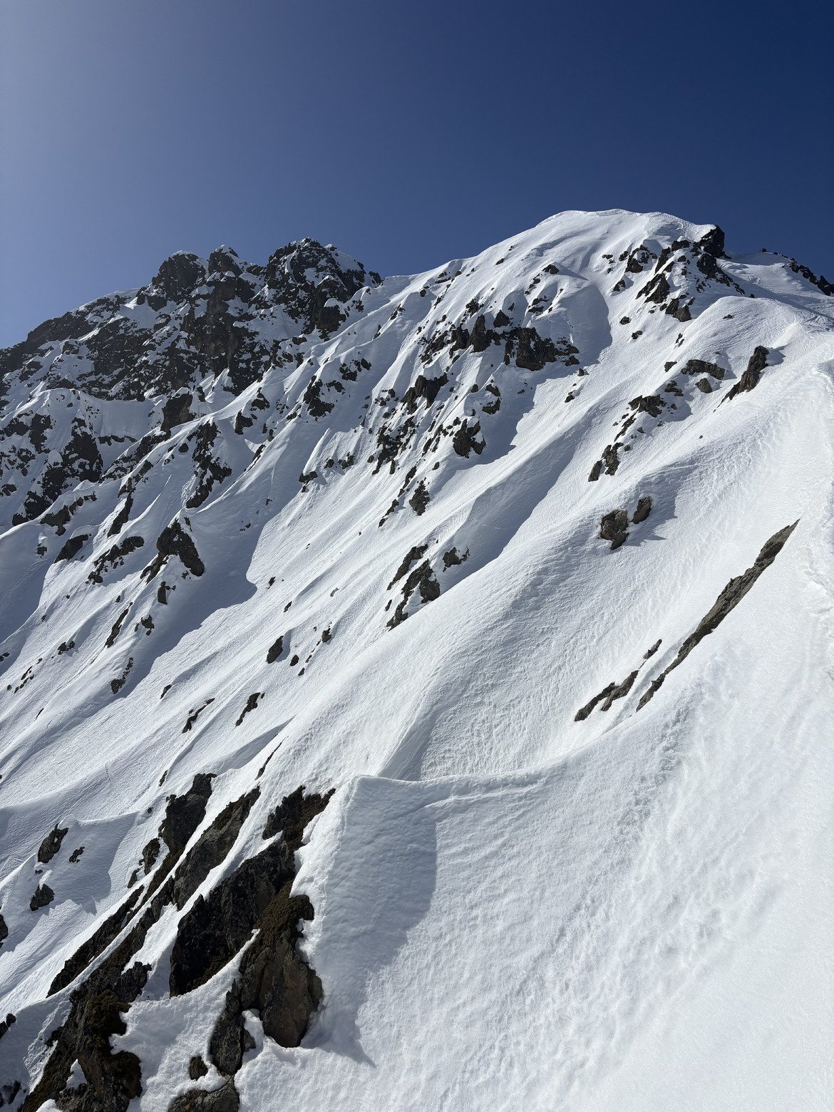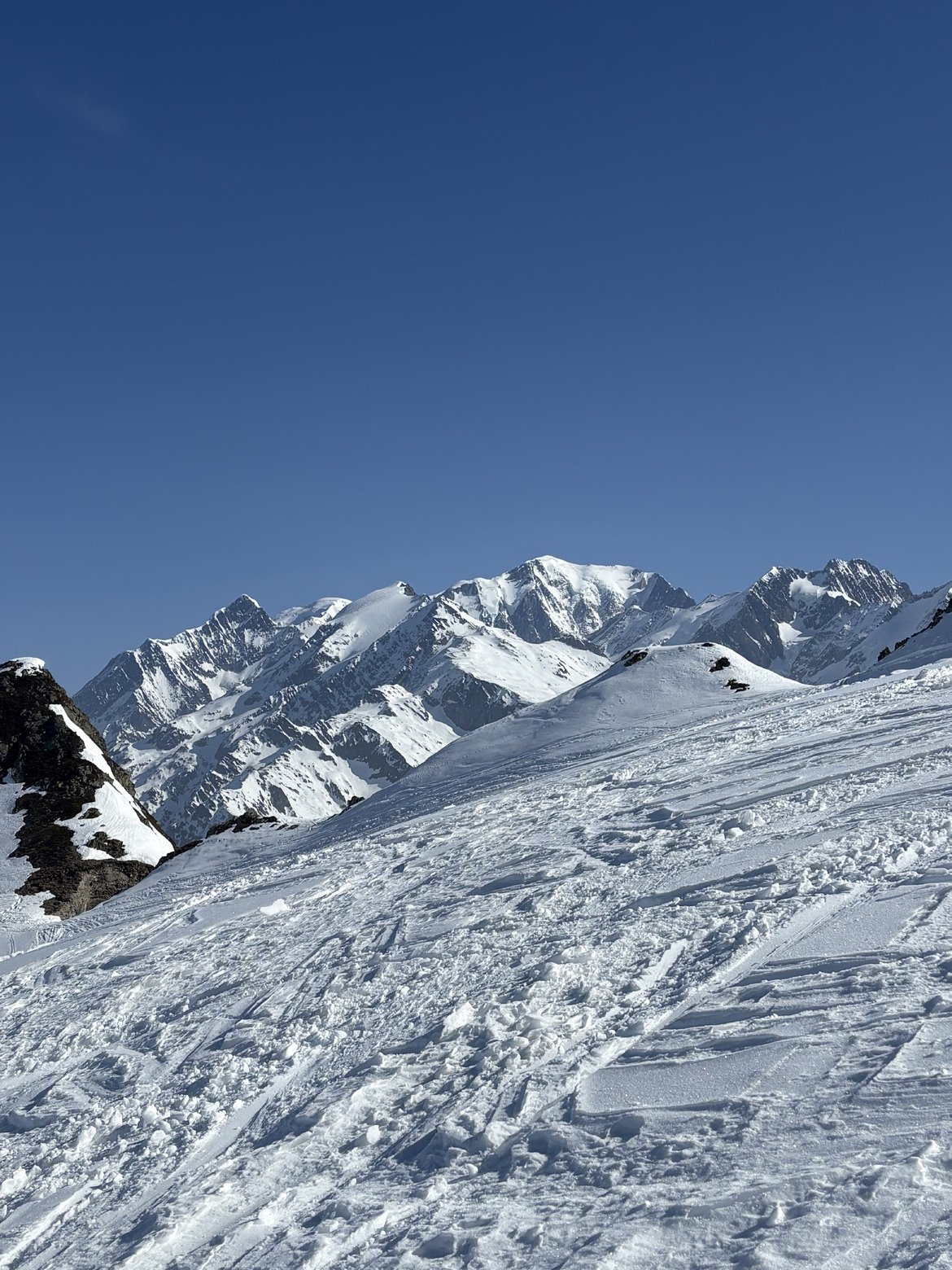 Cap sur Les Contamines-Montjoie, une station que je ne connais pas. Sur place, je discute rapidement avec un pisteur qui me conseille d’aller vers la Tête de la Cicle : plein de petits couloirs, rien de trop difficile, mais avec une belle ambiance.