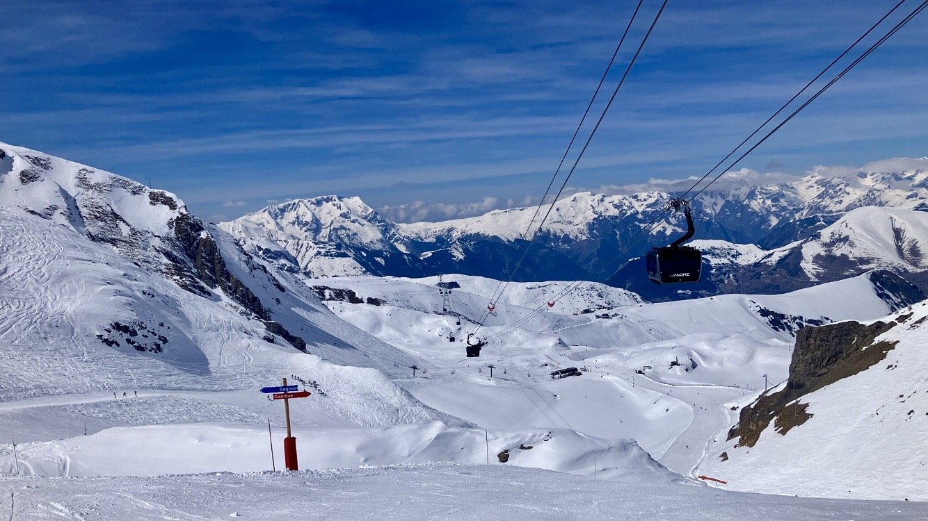 On fait deux rotations sur SuperVenosc et une sur VallĂ©e Blanche. La neige est dĂ©jĂ trop decaillĂ©e. On regarde avant de traverser ce qui fonctionne. TĂ©lĂ©siĂšge du Village Ă lâarrĂȘt et idem pour lâExpress. On prendra le telemix de Belle-Etoile. ArrivĂ© sur les crĂȘtes, descente sur le telemix du Diable par la Jandri 1 puis diable bleue.