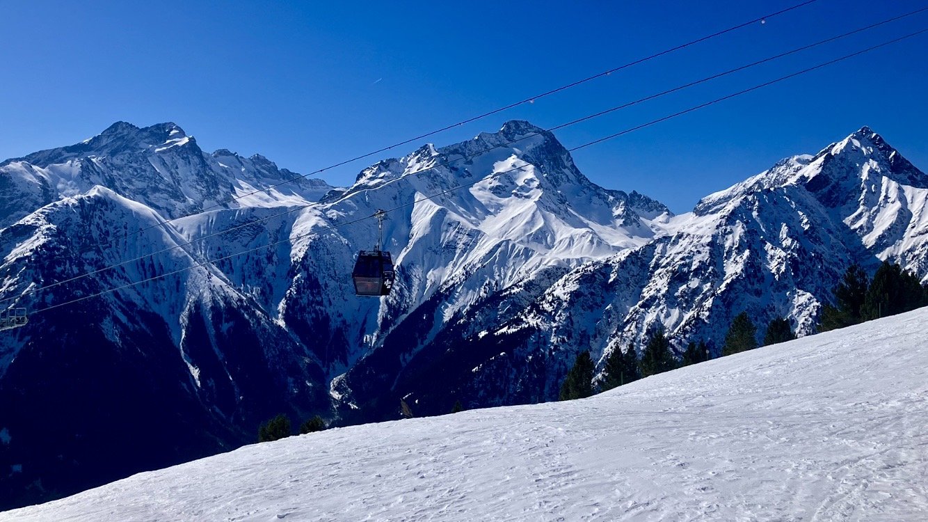 Du coup je chamboule l’itinéraire. En effet, avec le changement d’heure, Piet-Moutet sera trop dur. Alors on va directement chercher le Jandri pour monter à 3200. C’est fluide. Arrivés à 3200, il y a encore du vent de Nord-est. On prend les pioches puis la seconde piste, la plus à droite, elle est toujours sous utilisé, donc meilleure. Ensuite le Signal. Il est très bon à cette heure ci. Au télésiège c’est fluide.