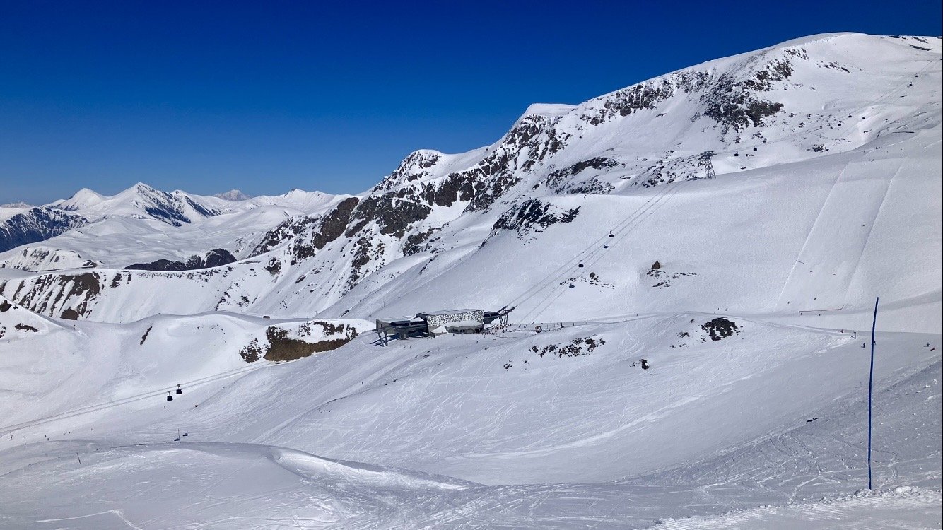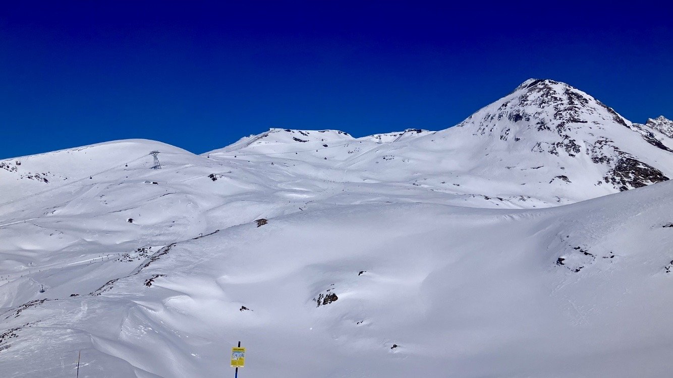 Au télécabine, c’est fluide. A 3200 , la bleue du Lac Mantel. Elle est parfaite. On remonte ensuite pour descendre sur la Mura, puis Bellecombe en trace directe.