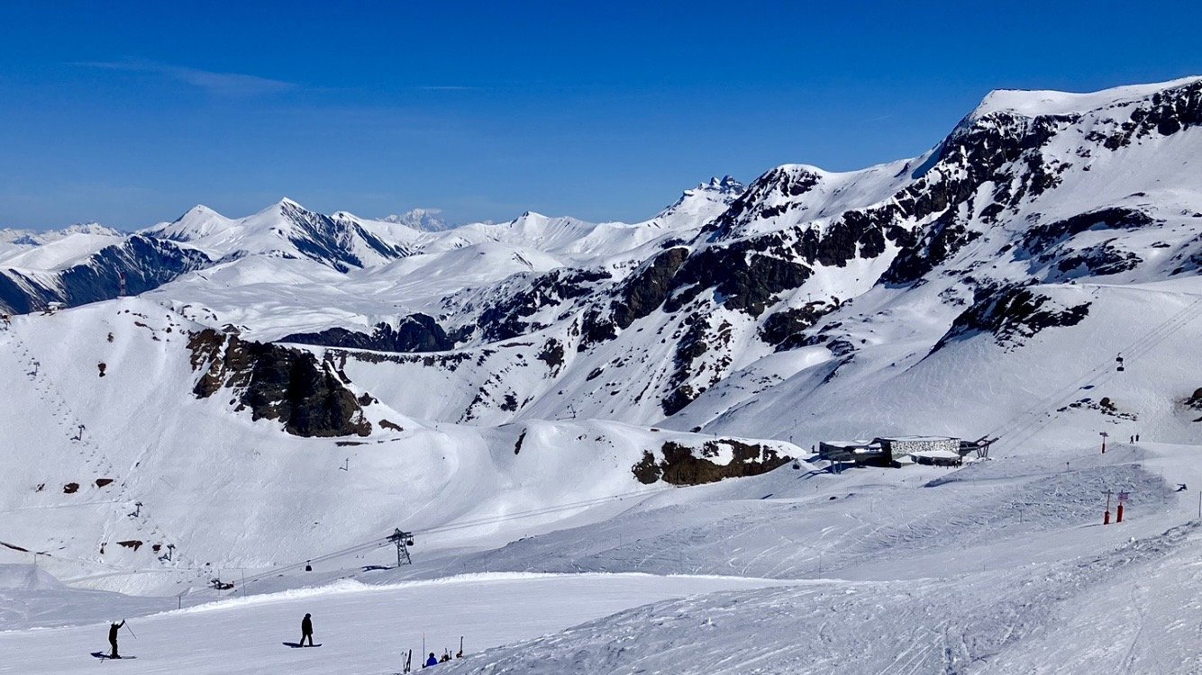 Un Lac Mantel bleue avant de remonter par le tĂ©lĂ©siĂšge du signal. Direction les Ă©crins pour aller sur la Toura. Et la, surprise du ski de printemps! MĂȘme Ă cette altitude, hier cela a bien fondue, puis damĂ© dans la nuit et gelĂ©.