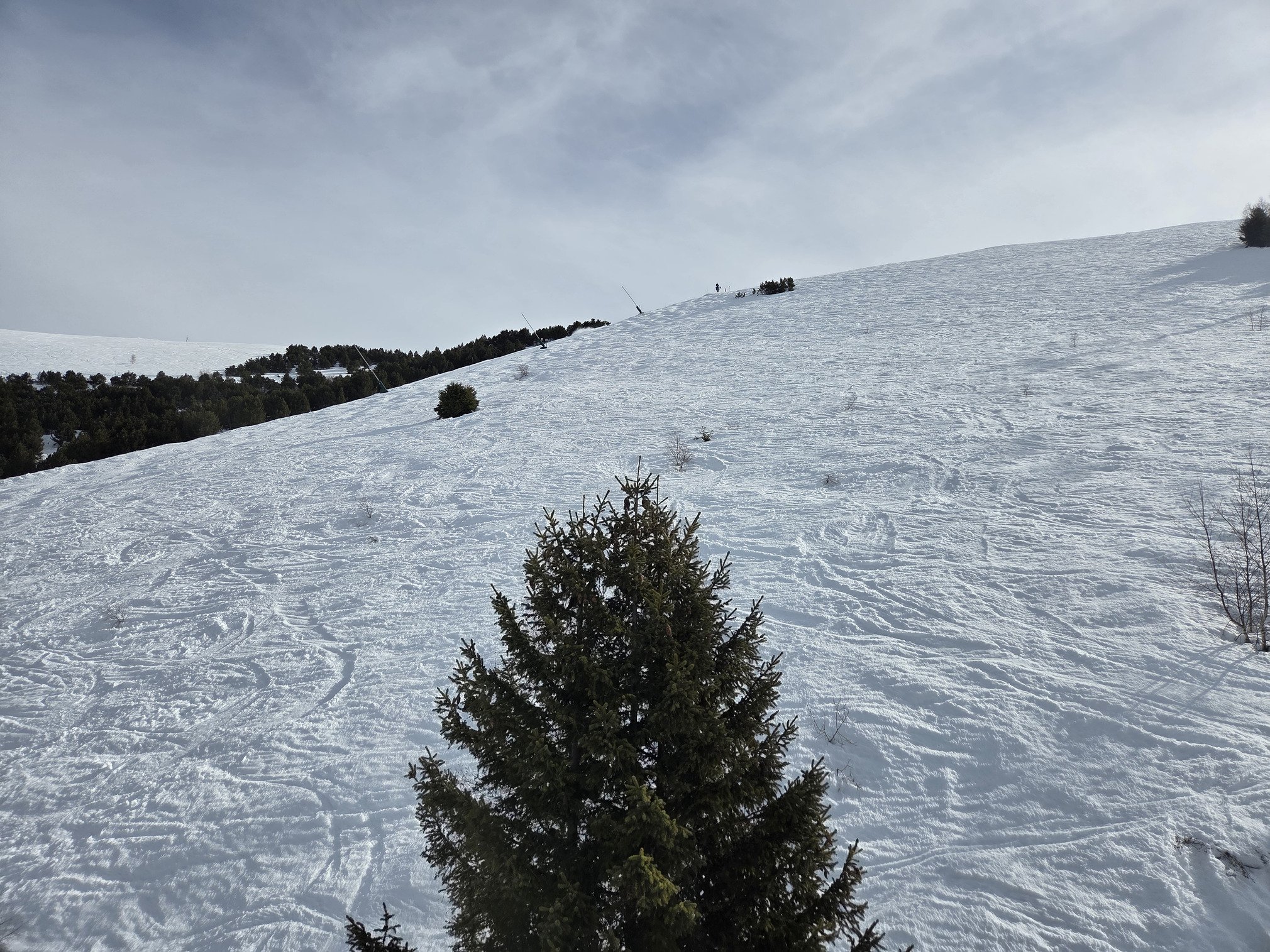 On prend le Jandri 2, à l’arrivée on voit que les pioches qui partent du bas ne fonctionnent pas aujourd’hui. Je comprendrais plus tard que les dameuses grattent la neige sous les premiers pylones. Est-ce que la hauteur de neige est un peu trop élevé à certains endroits sous les pioches ?