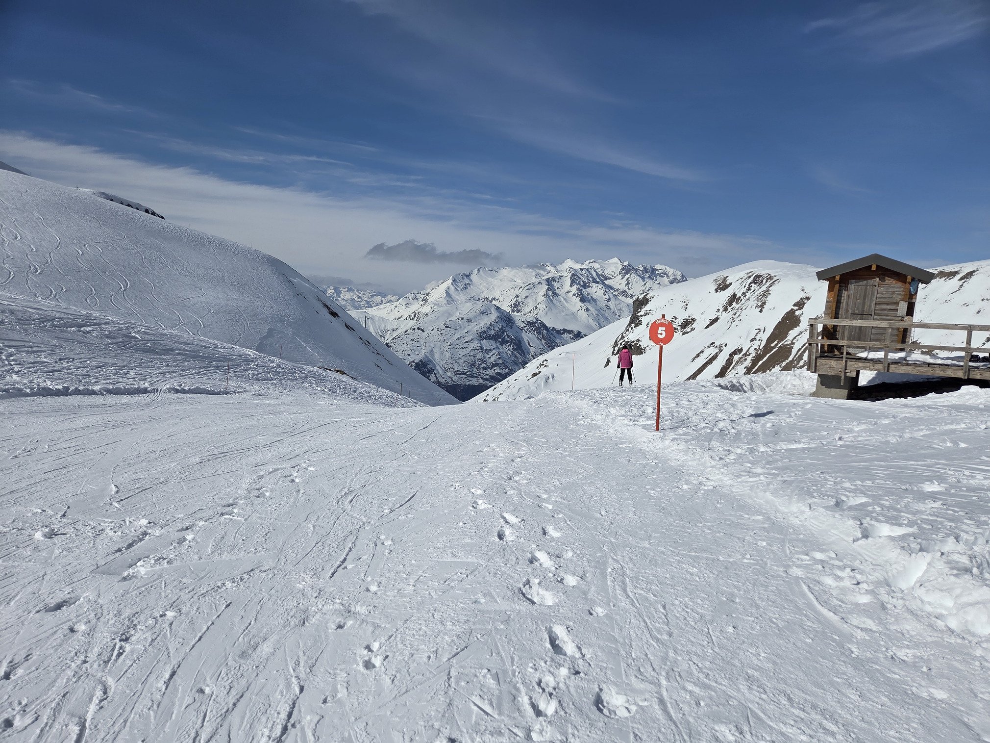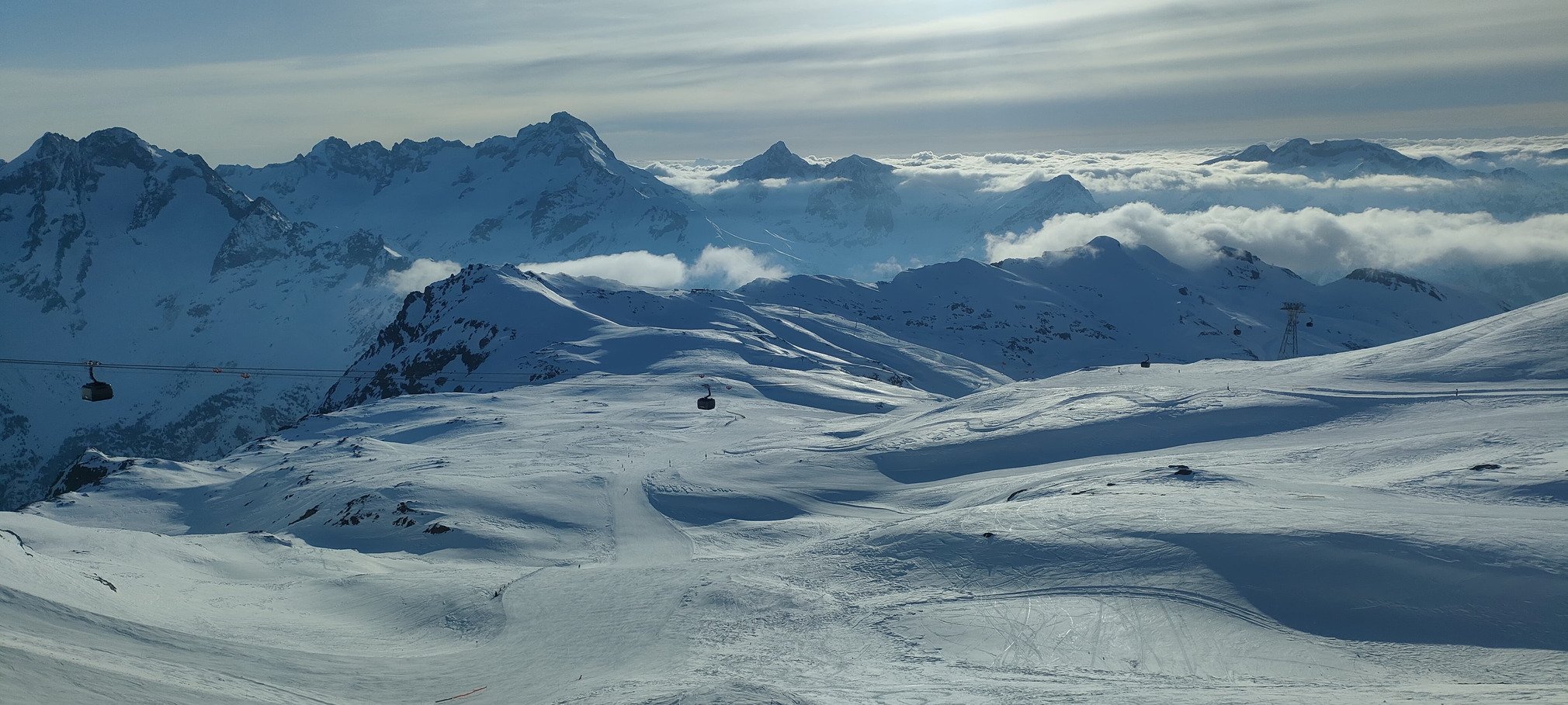 On monte sur la terrasse à l’arrivée en haut du Jandri 2, c’est magnifique, la mer de nuage est assez haute, il y a une petite table d’orientation pour les plus curieux. Il n’y avait personne sur les pistes aujourd’hui, mais grâce a la petite pause contemplative on croisera seulement 2 skieurs entre 3200 et 2600m.