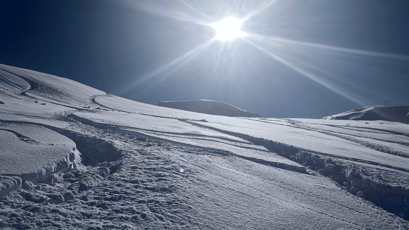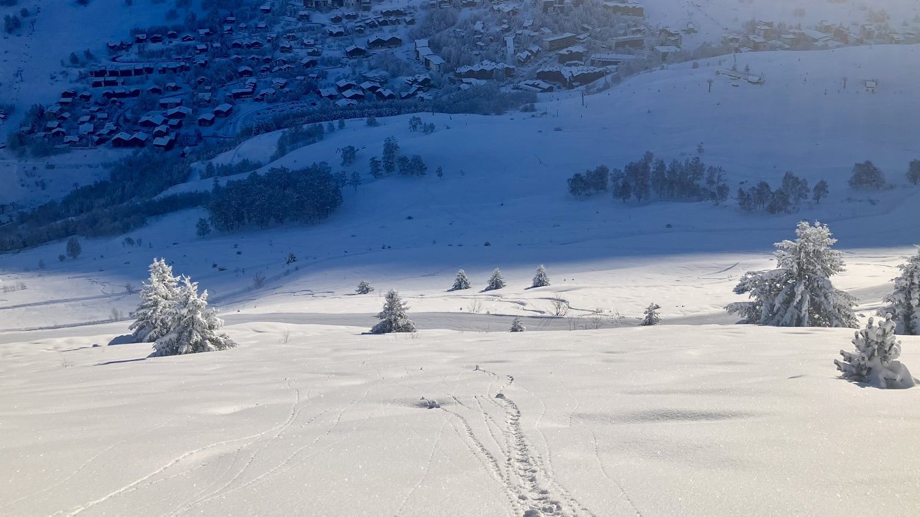 Aujourd’hui je souhaite alors voir les hors pistes plus haut sur le domaine. J’arrive aux Crêtes, télésiège planté 😩. Pas grave, je fais le hors piste de l’héliport au bas du Thuit en première trace. C’est bien épais.