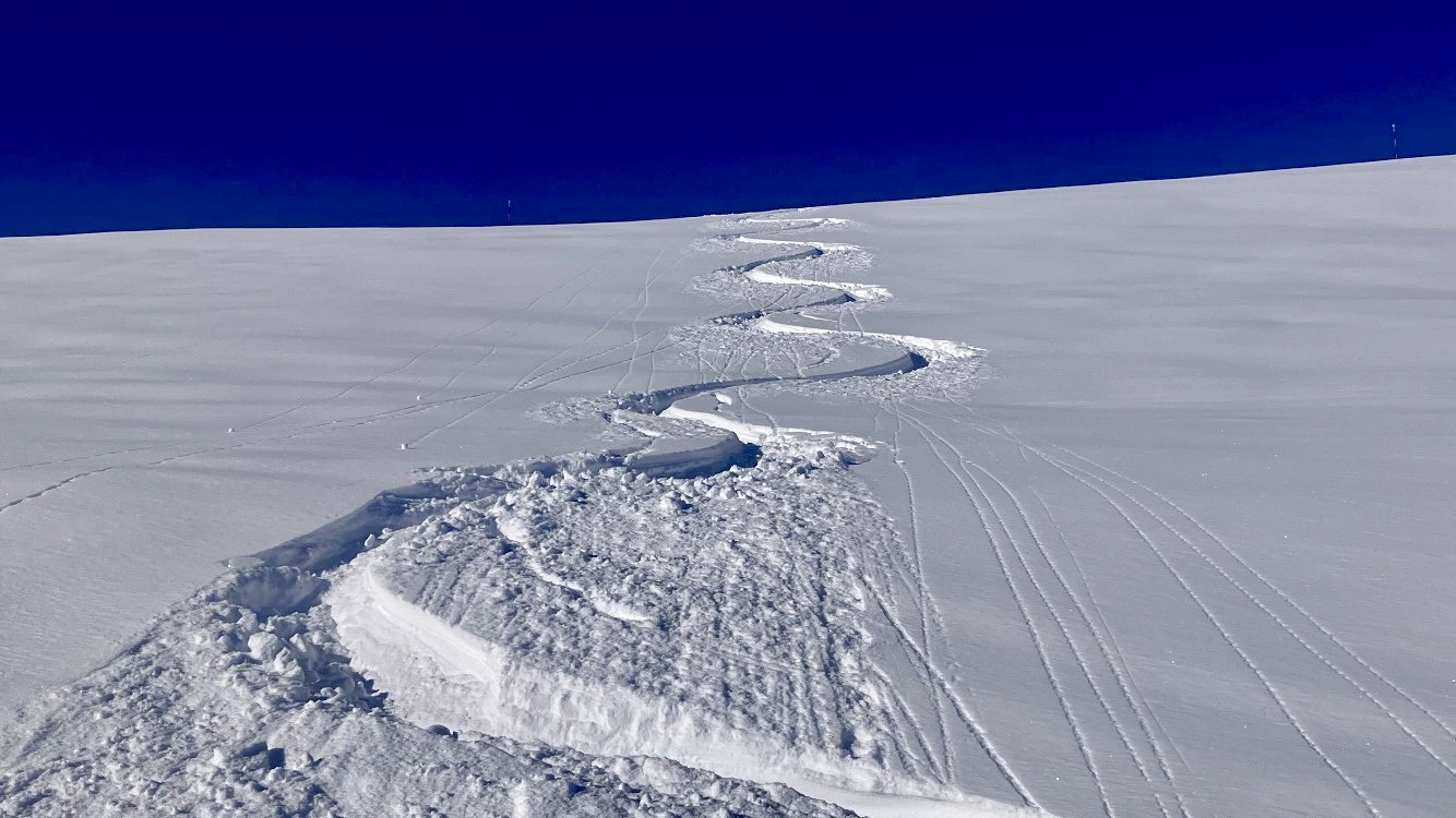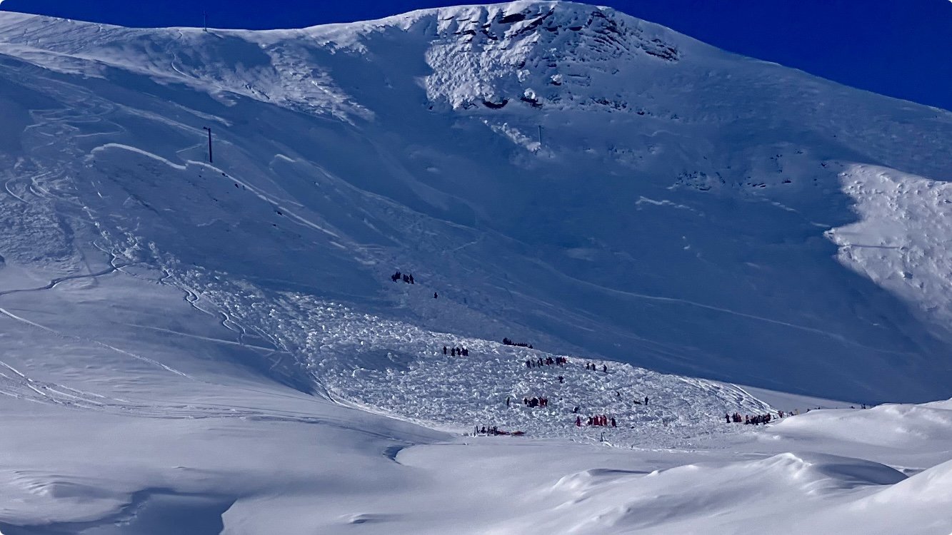 J’apprends par la suite, que la personne n’était pas équipée, que c est le chien d’avalanche qui a permis de le marquer. Il est sortie en arrêt Cardio-respiratoire. Heureusement, les secours arrivent à le faire repartir, ouf! Il est évacué en hélicoptère. Je mets une photo de l’avalanche.
