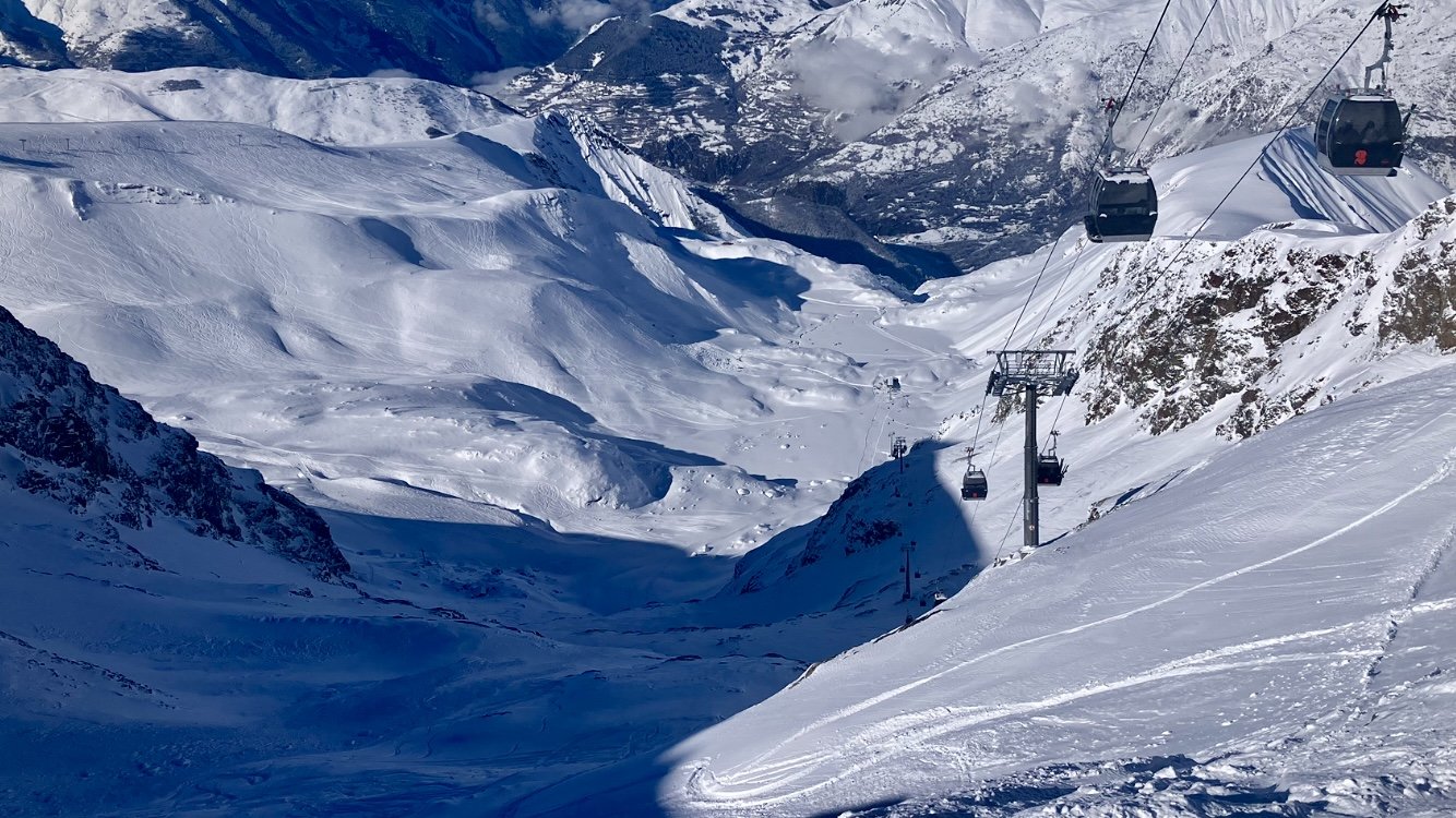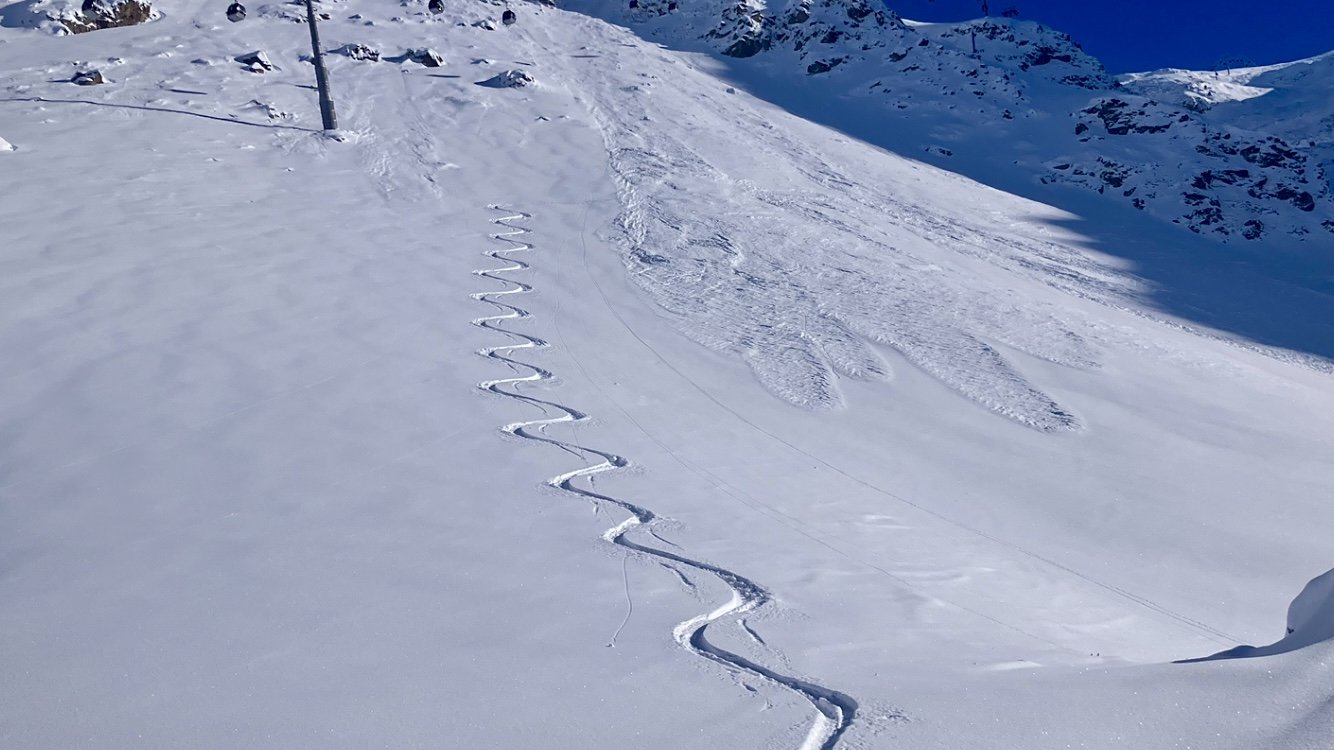 Je fais la trace sur le plateau pour rejoindre le départ en hors piste que j’ai choisie. Il faut pousser sur les bâtons 😅. Je fais 2 rotations jusqu’au bas, pour remonter par le télésiège de la côte et le telemix de Vallée Blanche. Environ 40cm de bonne neige bien légère.