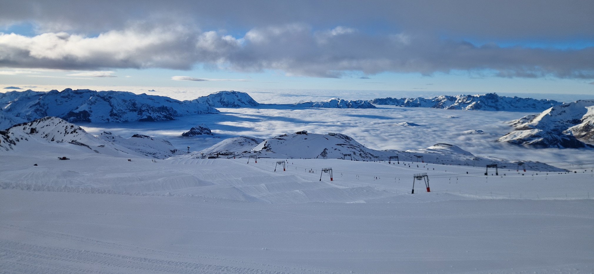 Au dessus de la grosse mer de nuage à 2000m environ, c'est absolument magnifique, la neige est plutôt bonne car bien froide même si le vent a énormément travailler le haut du domaine.