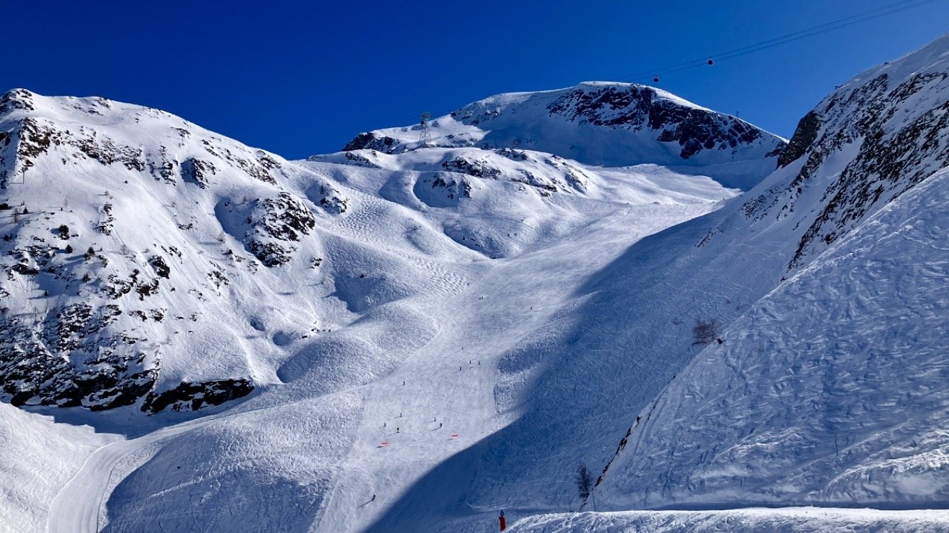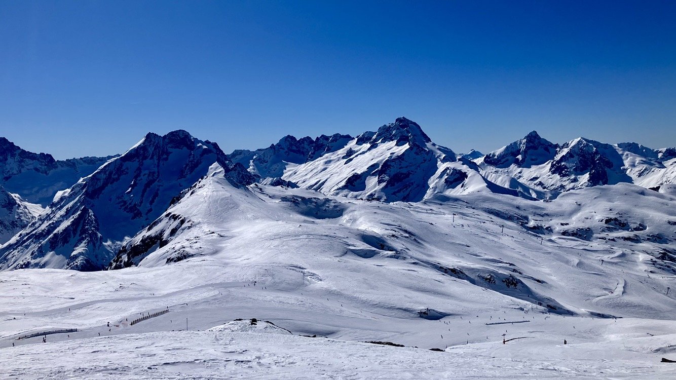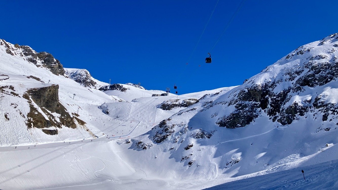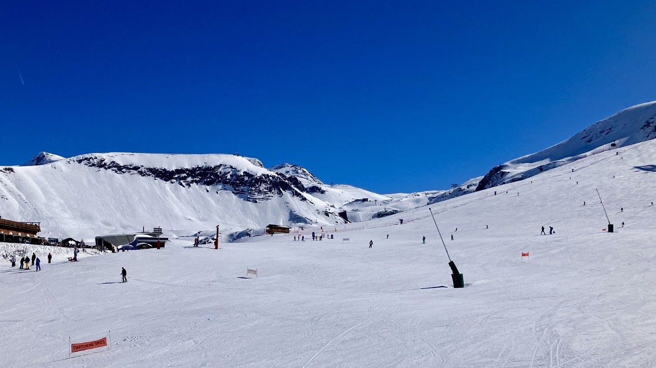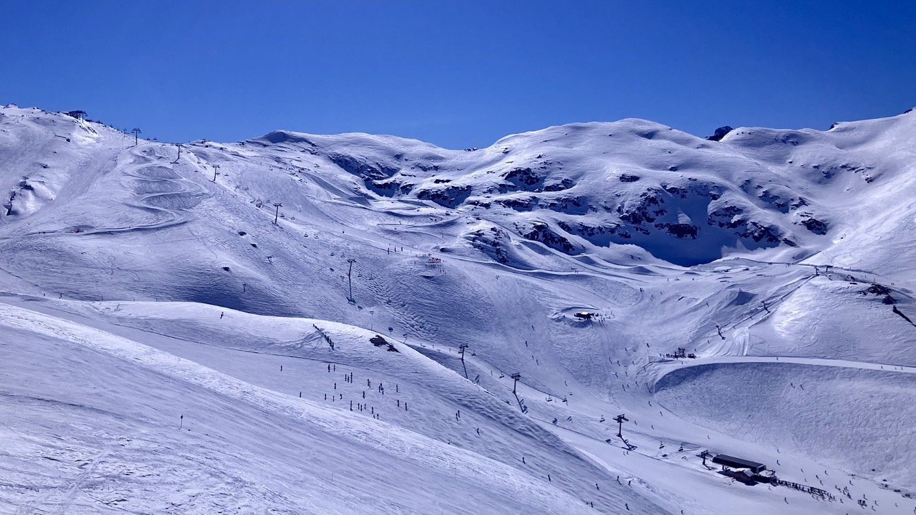 Direction la Toura par la bleue des écrins. Dans le S, ça carve avec bonheur 😜. Comme c est bien fluide à la Toura, je fais deux rotations, par le grand creux et le Lac Noir. La neige est nickel pour carver. Juste quelques bosses en sortant du télésiège.