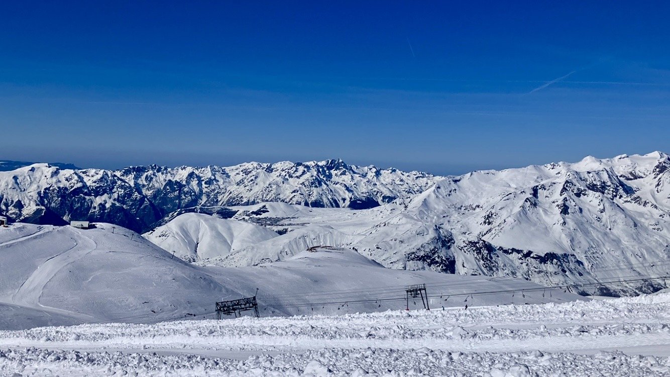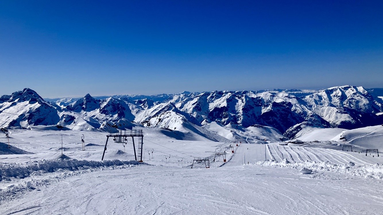 Départ 10h30 pour passer 1h30 sur Piet-Moutet. Quelques degrés de moins qu’hier, 3 ou 4 je pense. Piste verte puis bleue vers SuperVenosc. Neige de printemps sur le dernier mur.