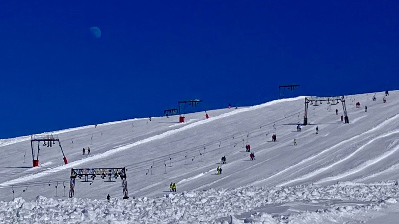 Sur les pioches j’arrive juste quand ils mettent les deux en fonctionnement. Il commençait à y avoir de l’attente. En haut, je vois la lune, qui a rendez-vous avec le soleil ( voir photo, j’espère que cela sera bien visible ) Descente par Jandri 5. Ça carve. Balade du Jandri, très jolie paysage sur cette piste. Puis Jandri 3 pour descendre en direction de Bellecombe. Un peu de monde à l’intersection avant d’arriver au télésiège.