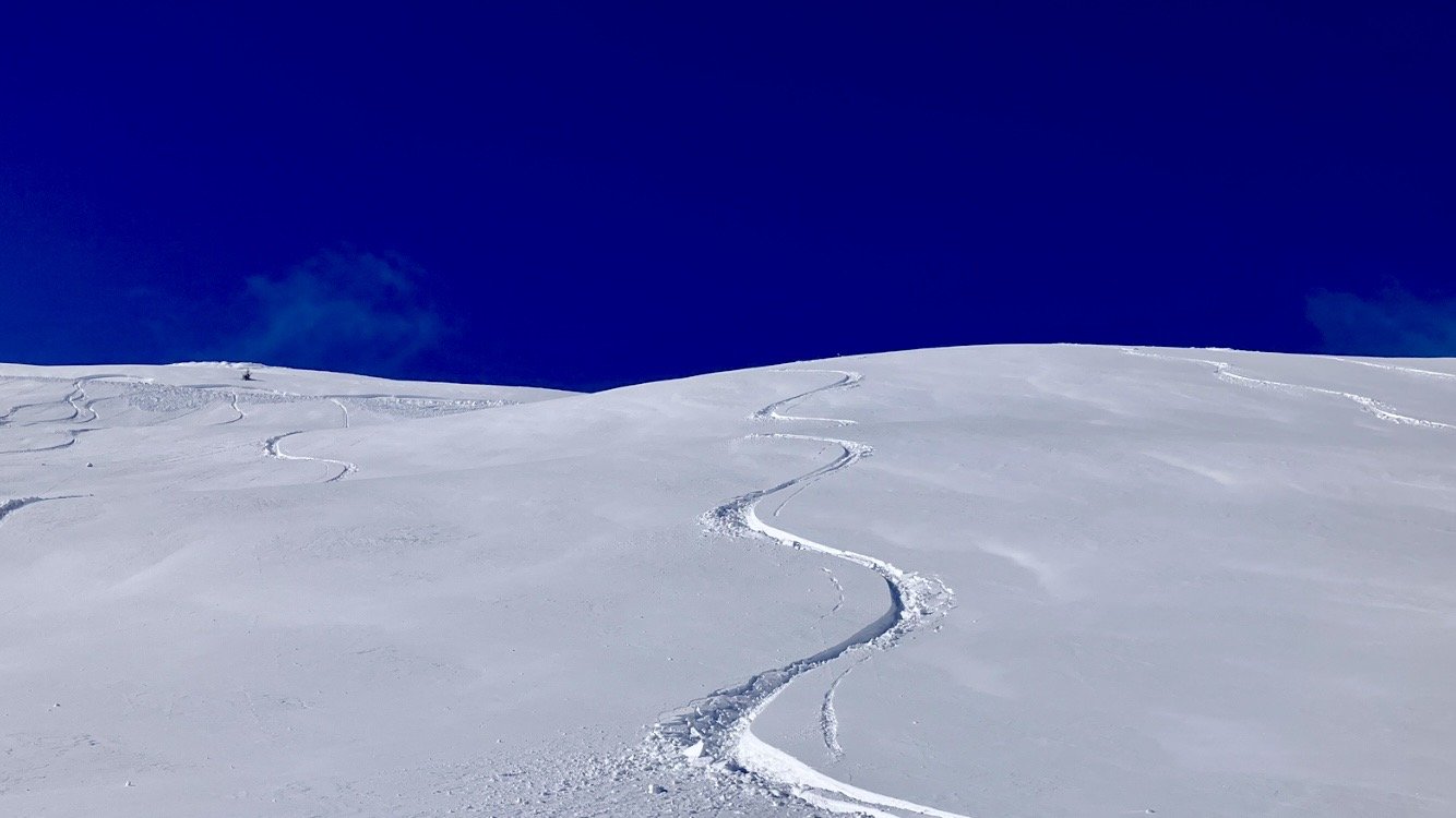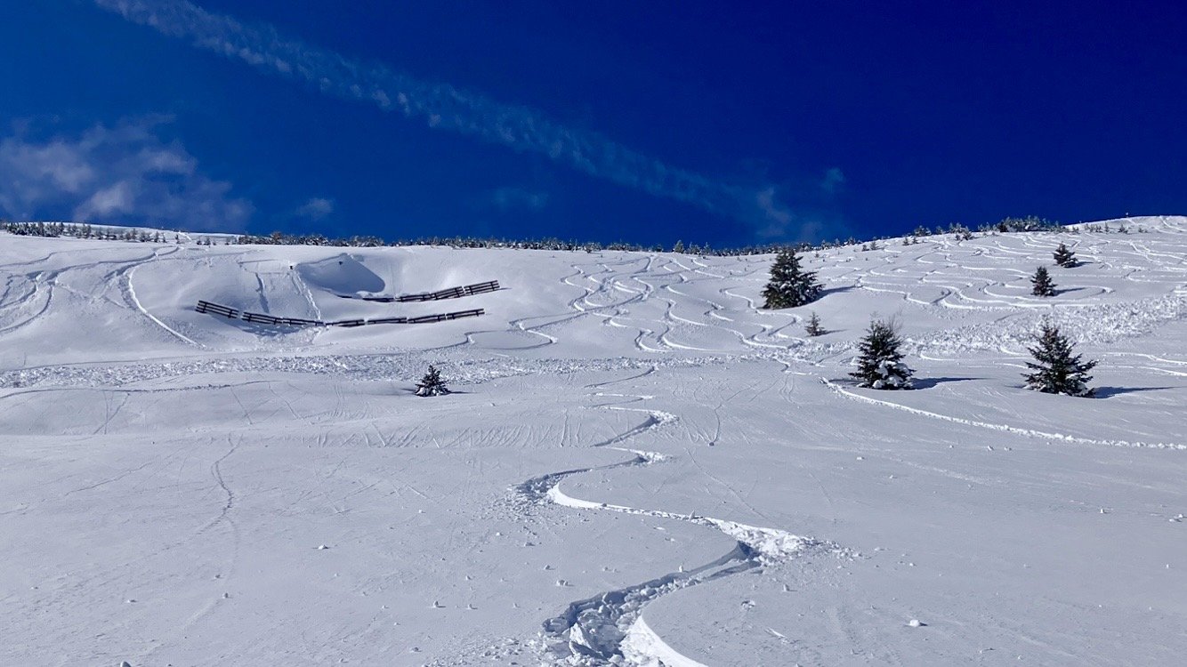 Descente jusquâau tĂ©lĂ©siĂšge du Village par le hors piste, en coupant 3 fois la piste des demoiselles. Il nây a pas encore trop de monde. Seconde rotation au mĂȘme endroit, je prends mon temps pour la marche dâapproche. La neige est top! C est dĂ©jĂ bien tracĂ© sur le bas, mais avec une telle Ă©paisseur, ça passe crĂšme !