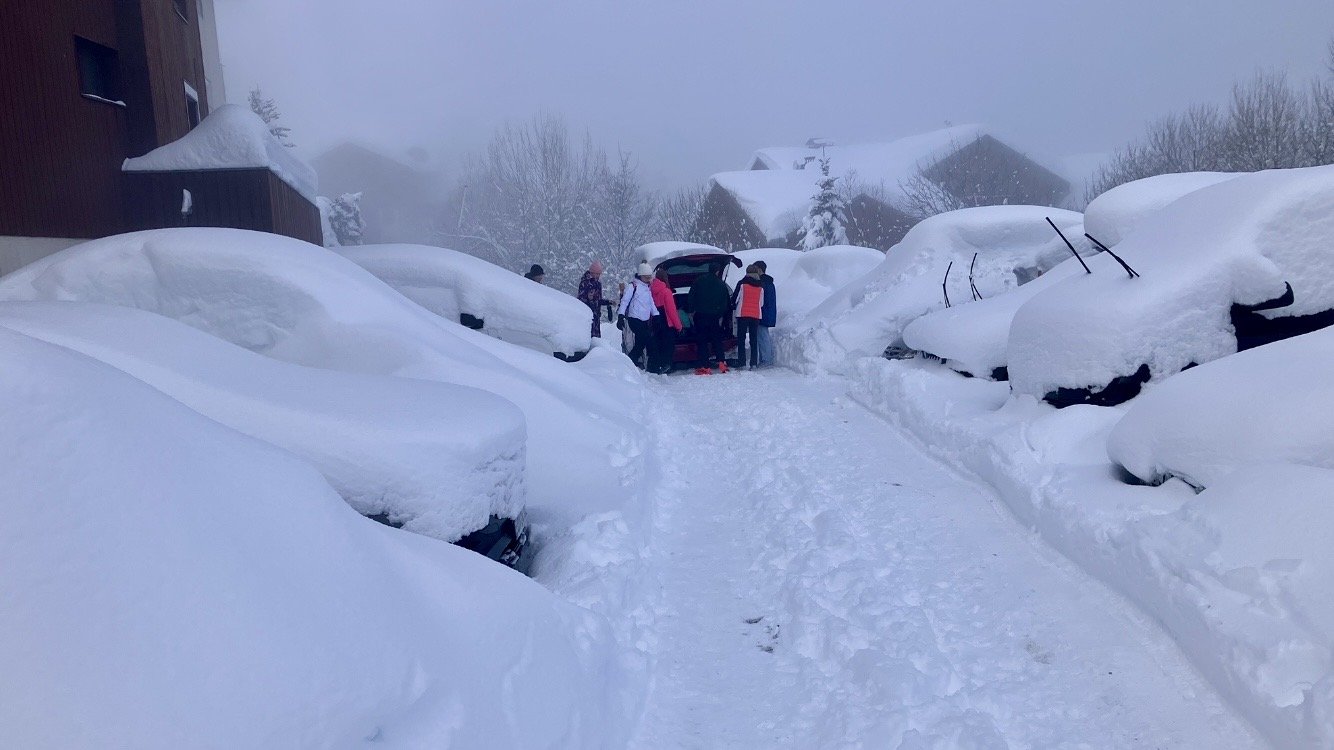 Il est 10h45, je passe par la piste du petit plan, pour changer de casque et de masque. Je passe dâun masque jaune Ă mon BollĂ© 0/4, car le soleil va arrivĂ©. Direction VallĂ©e Blanche, par le Montana, ça me permet de voir que demain, cela ne va pas ĂȘtre triste pour les touristes qui ont leurs voitures complĂštement ensevelies par la neige!