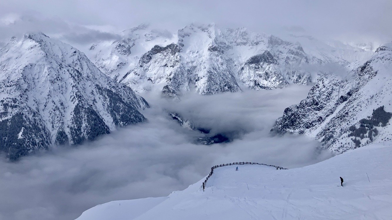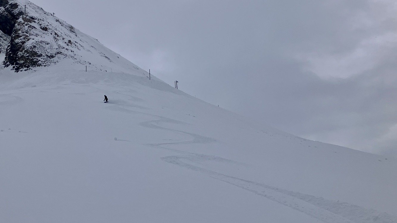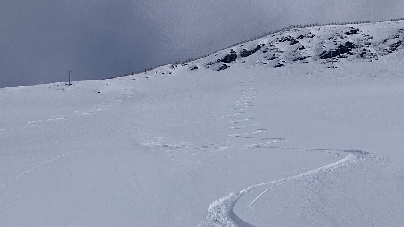 ArrivĂ© Ă 3200, les pioches sont fermĂ©es, le signal aussi, idem pour la brĂšche et la Mura. Il reste le bord de piste. Je me dis quâavec mes Csar de chez Salomon au rocker inversĂ©, si on fait piste, je vais bien galĂ©rĂ©đ„Ž. Finalement, c est moins pire que ce que je pensais. La neige est douce, les pistes pas trop bosselĂ©es, et en faisant les cĂŽtes ça passe.