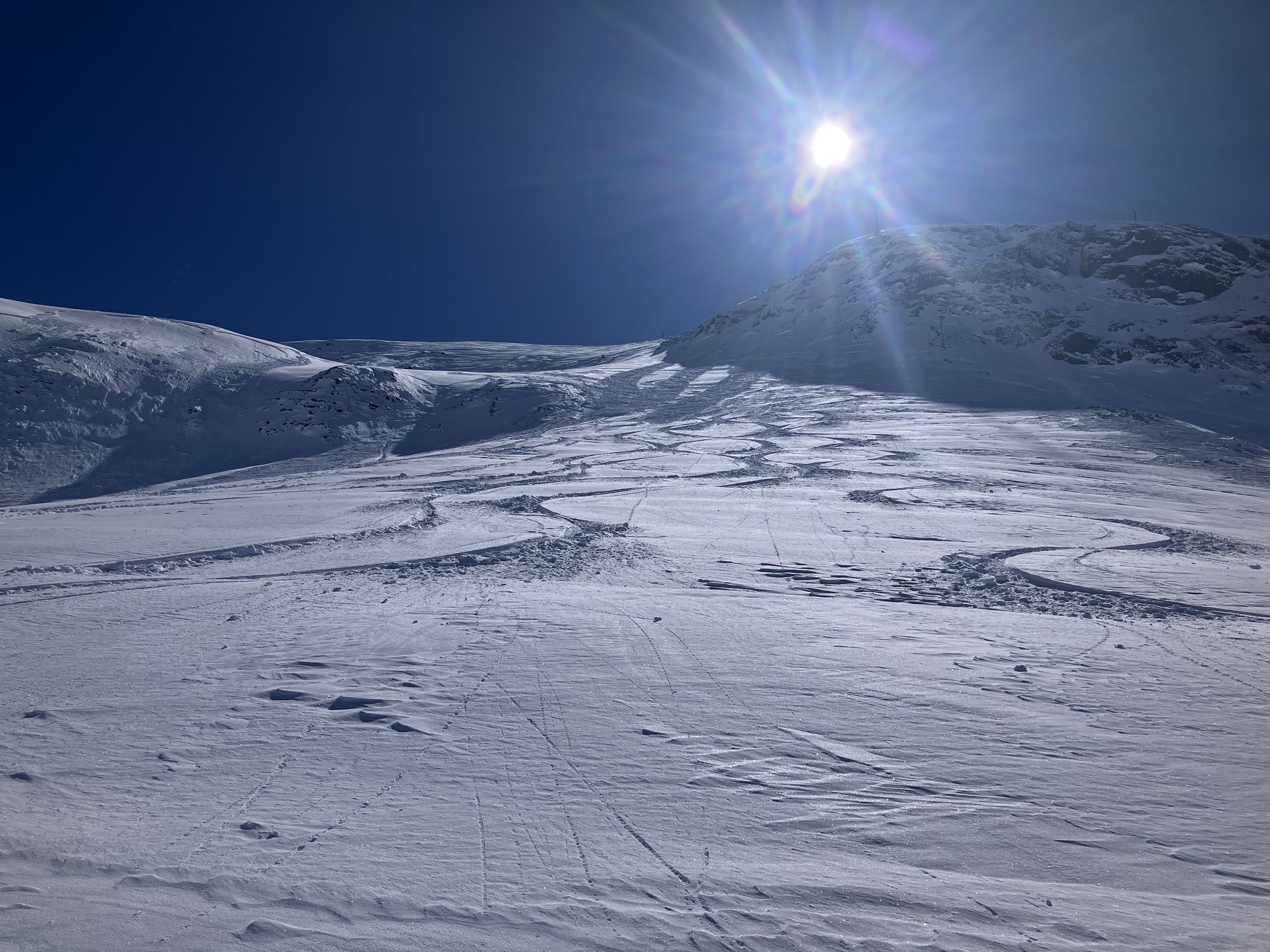 On prend le premier siĂšge sur VallĂ©e Blanche. Le petit bout de piste avant dâaller chercher le dĂ©part du hors piste est formidable. Tout damĂ©e et la neige top. On sâengage sur le chemin qui nous mĂšne au dĂ©but de lâancienne piste noire.