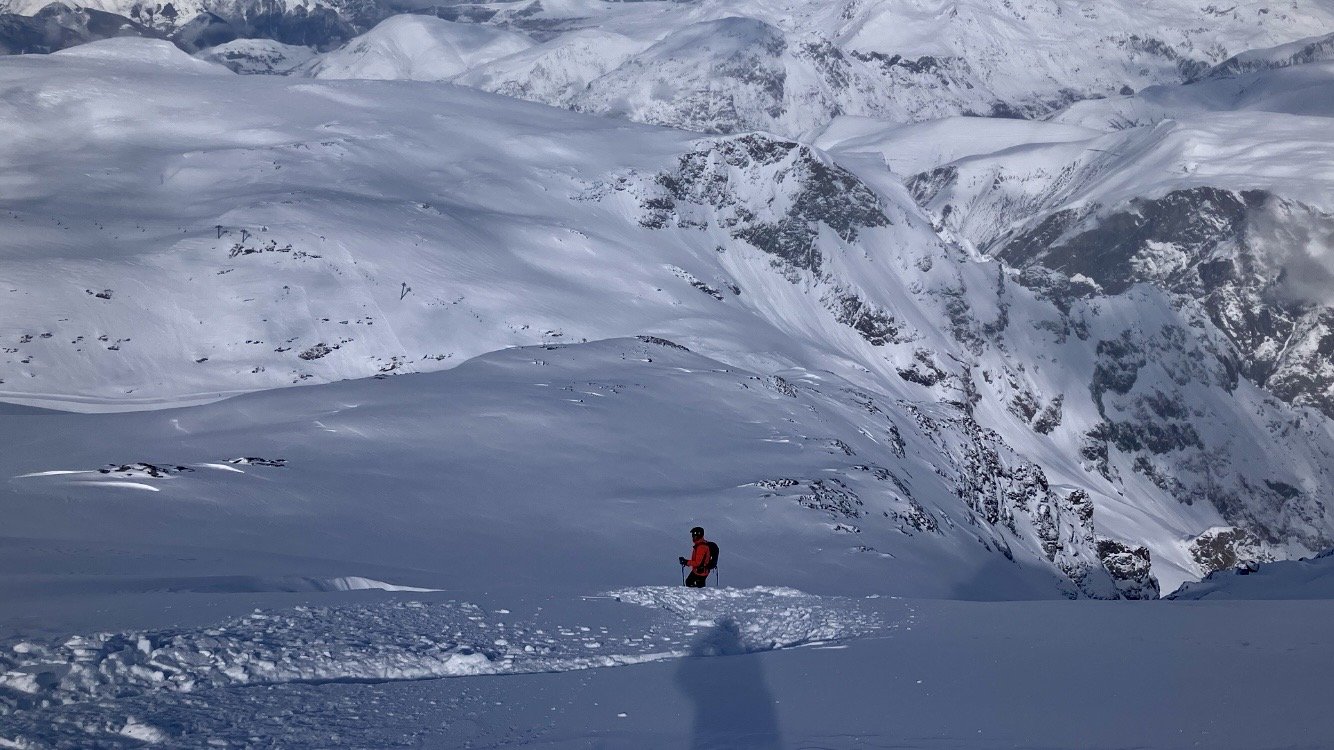 On est les premiers Ă faire la trace. C est juste magnifique, et je regrette mes 120. Il y a une telle Ă©paisseur que je suis un peu juste en 90. Du coup, je ski un peu en arriĂšre pour sortir mes spatules, et jâen paierais le prix en fin de session, avec de lâacide lactique pleins les quadricepsđ„”.