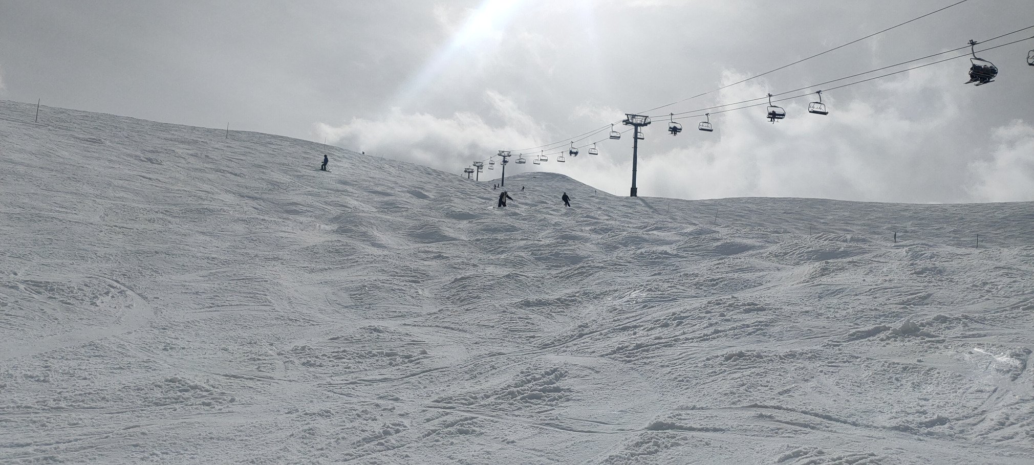 Même si ce n'était pas blindé comme en pleine saison, il y avait tout de même du monde aujourd'hui. Pas franchement gênant en termes d'attente aux remontées (hormis 5 minutes à Jandri et aux pioches en début de journée), beaucoup plus en termes de dégradation des conditions de ski au fil des passages.