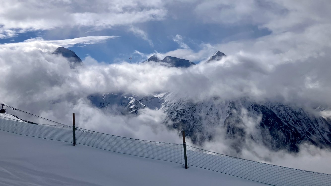 Je dois attendre 3 à 4 minutes car seul le bout de mes spatules est visible. Voilà c est mieux. Je descends, il y a bonne couche, et la neige est nickel. Pas du tout lourde. Pour cette première rotation, je rattrape le télésiège de la Fée par la face Nord.