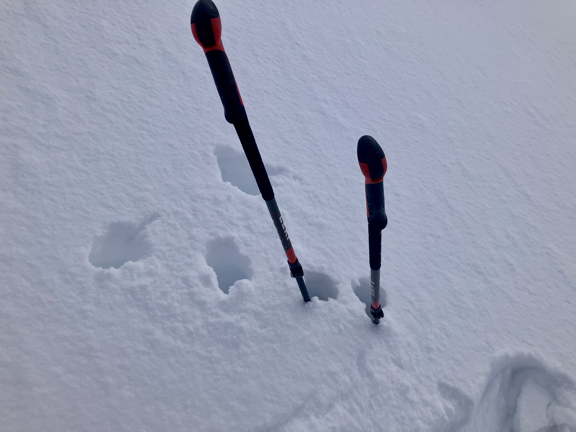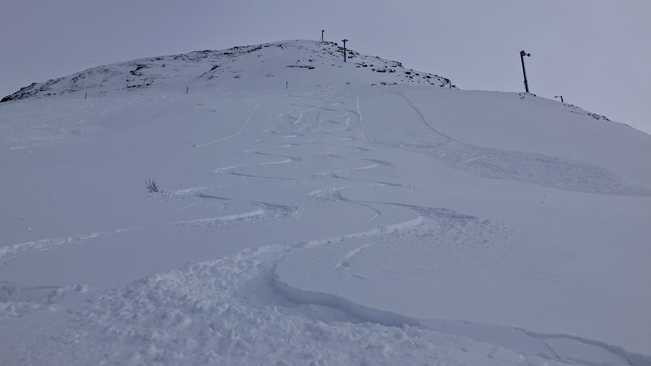 Je remonte pour faire une rotation complète jusqu’au bas du Thuit, car c est beaucoup plus clair en dessous. Et où la neige est la plus profonde ? La! Depuis le début de saison, c est toujours la que je trouve le plus de neige. J’arrive à faire deux traces parallèles avant qu’une horde sauvage me voyant descendre, viennent tout laminés 🫣.