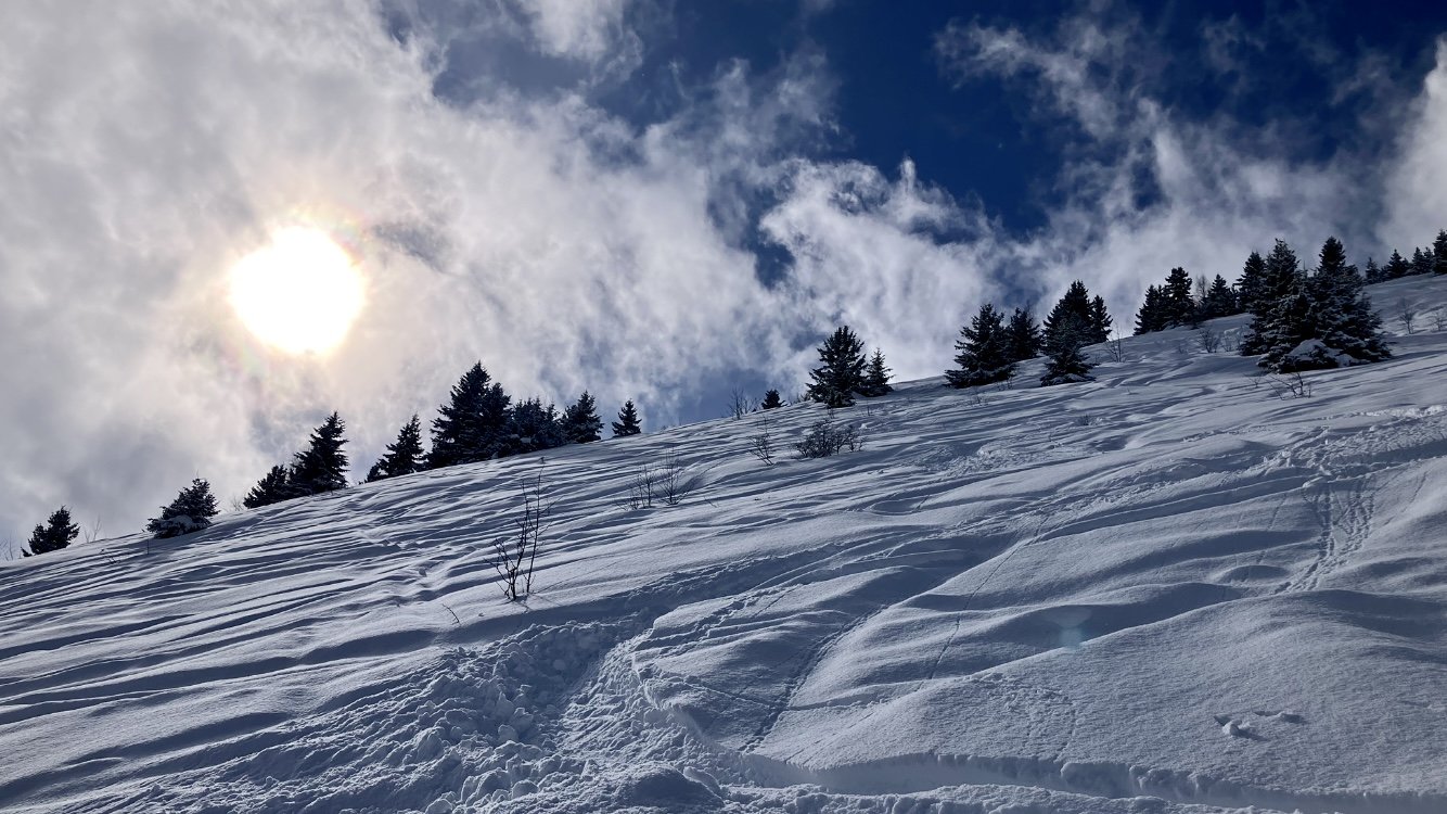 Le soleil s’impose en ce début d’après midi et le haut du domaine doit être bien skiable. Attention, c est 4/5 ici. Je passe quatre heures bien sympathique mais il faut rentrer.