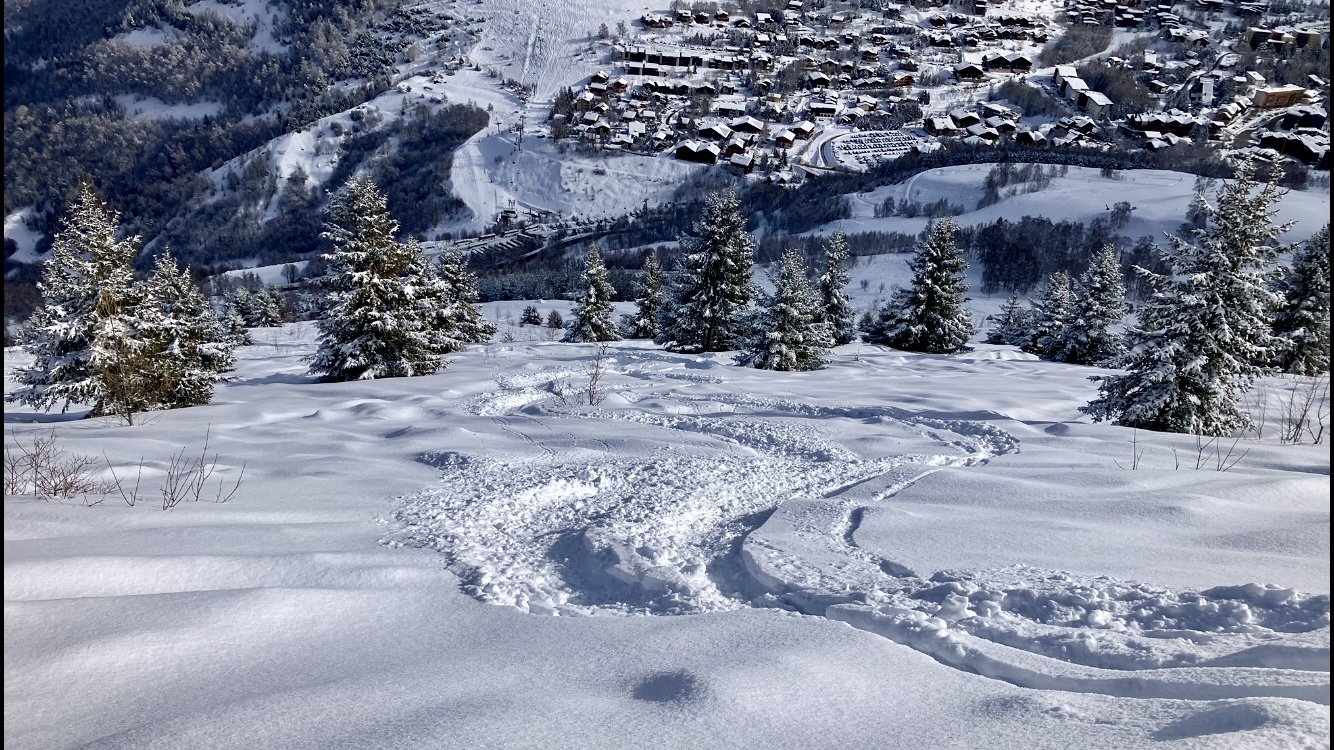 Une descente sur Venosc par le hors piste, mais le bas est déjà tout trafolé. Je ne fais qu’un seul passage.
