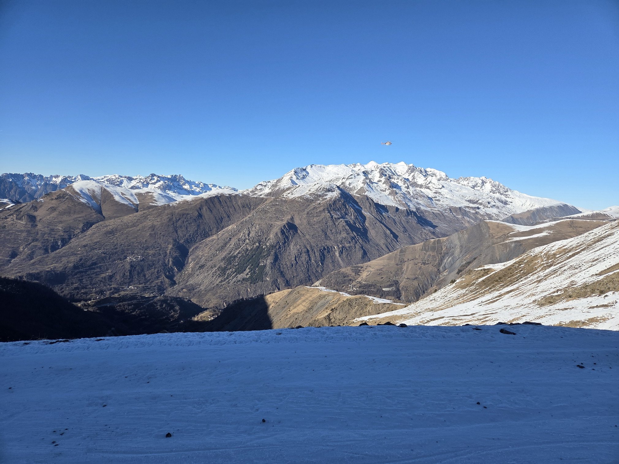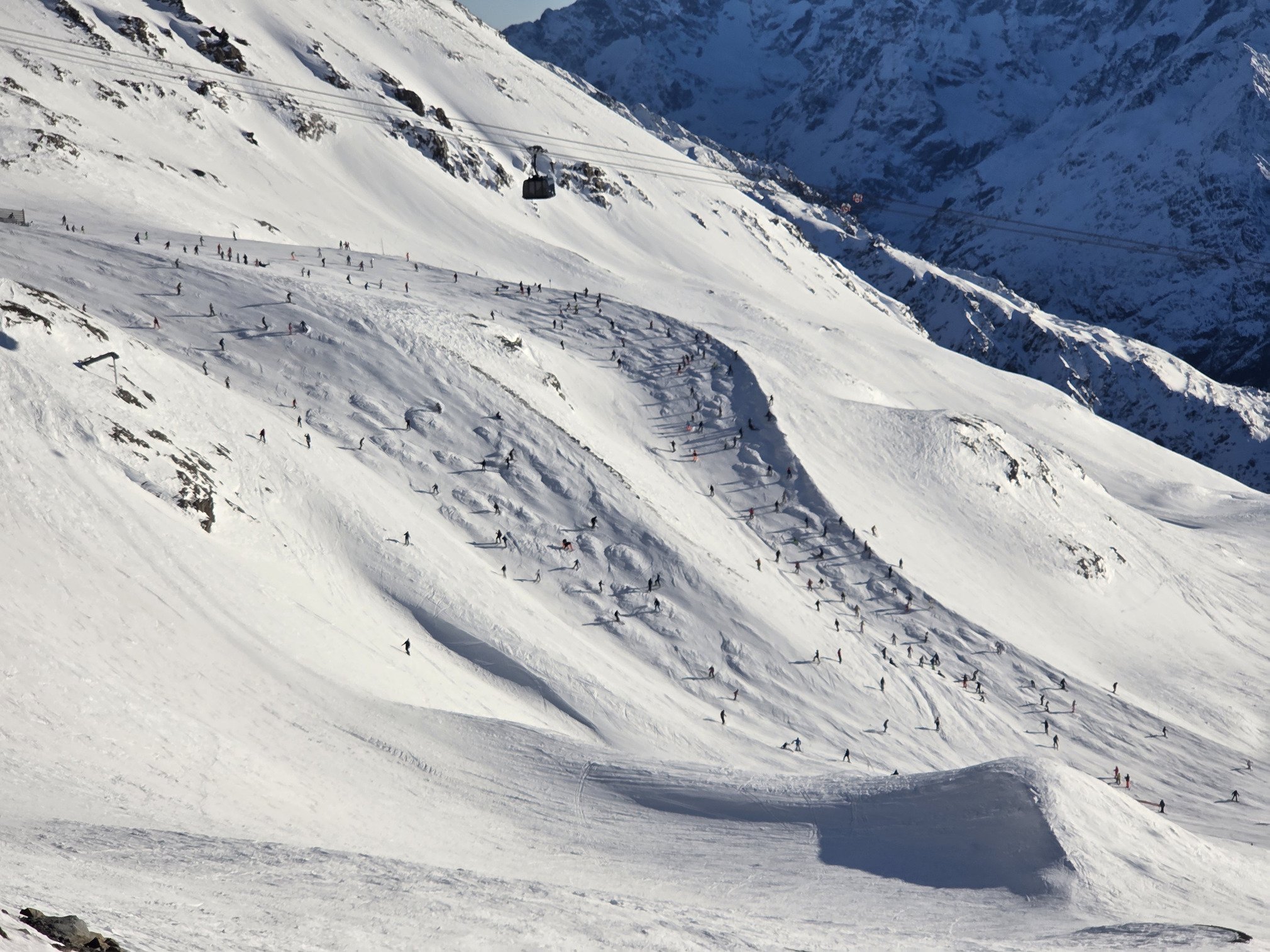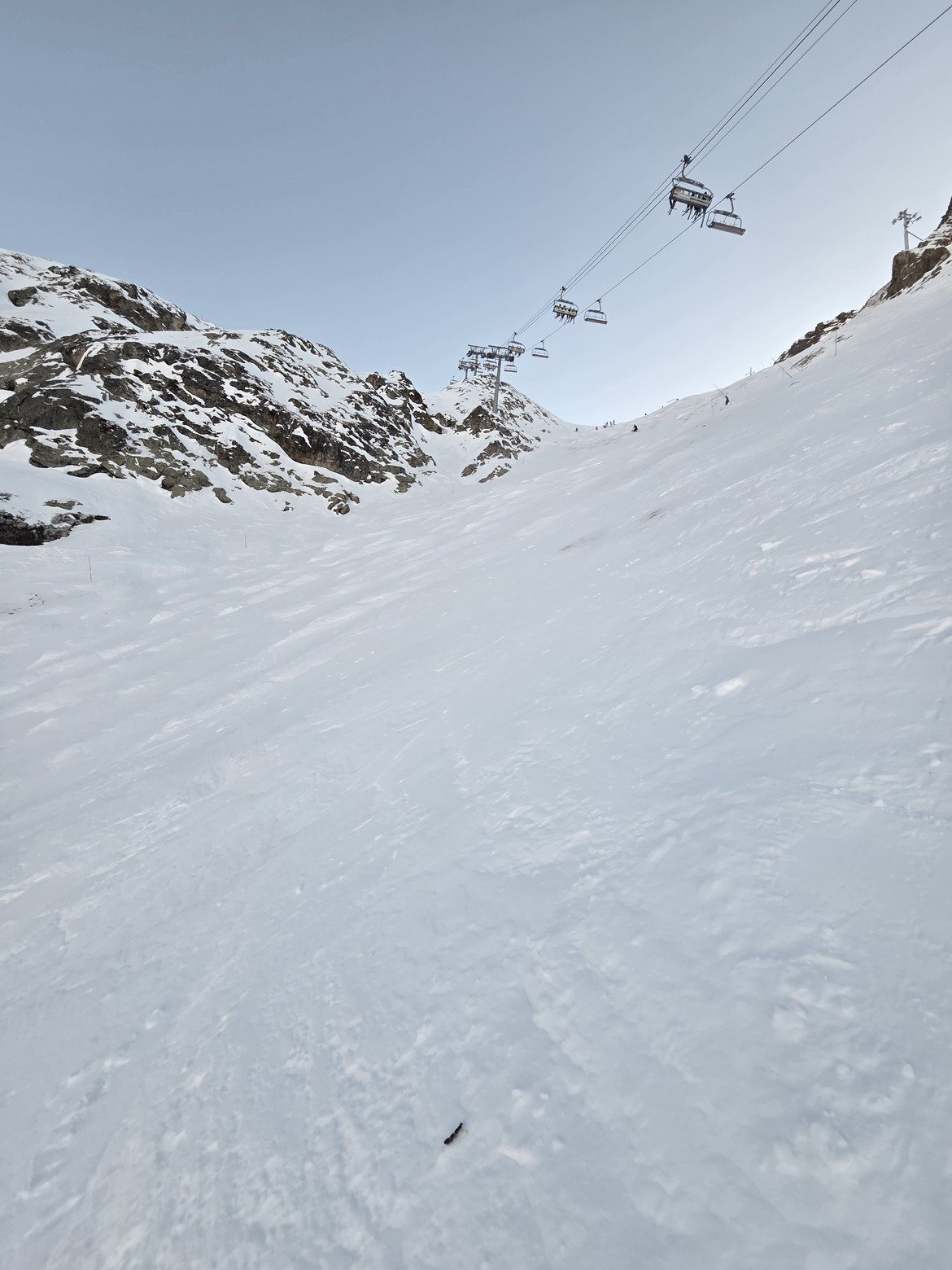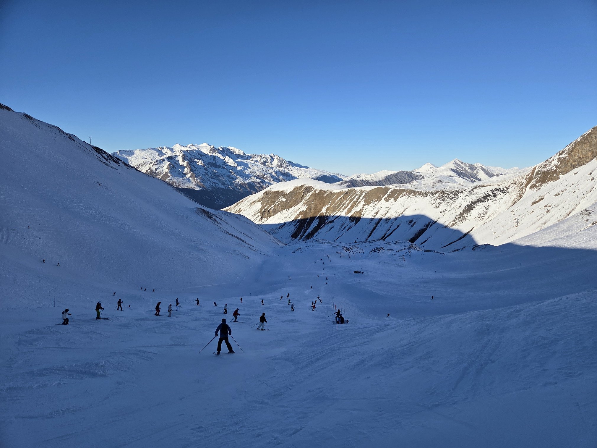 Descente par Jandri 1, vers 14h30, déjà un peu de monde, mais rien de comparable à la foule qui va passer 2h plus tard. Une neige correcte, des gros tas de neige qui permettent de freiner fort et de tourner. Peu de monde pour remonter sur le Jandri 1, le 2 est toujours blindé, ça sera le cas quasiment toute la semaine. On remonte par Pierre Grosse, et en redescendant par Mura on assiste à une procession de skieurs sur Jandri 4 qui rentre à la station.