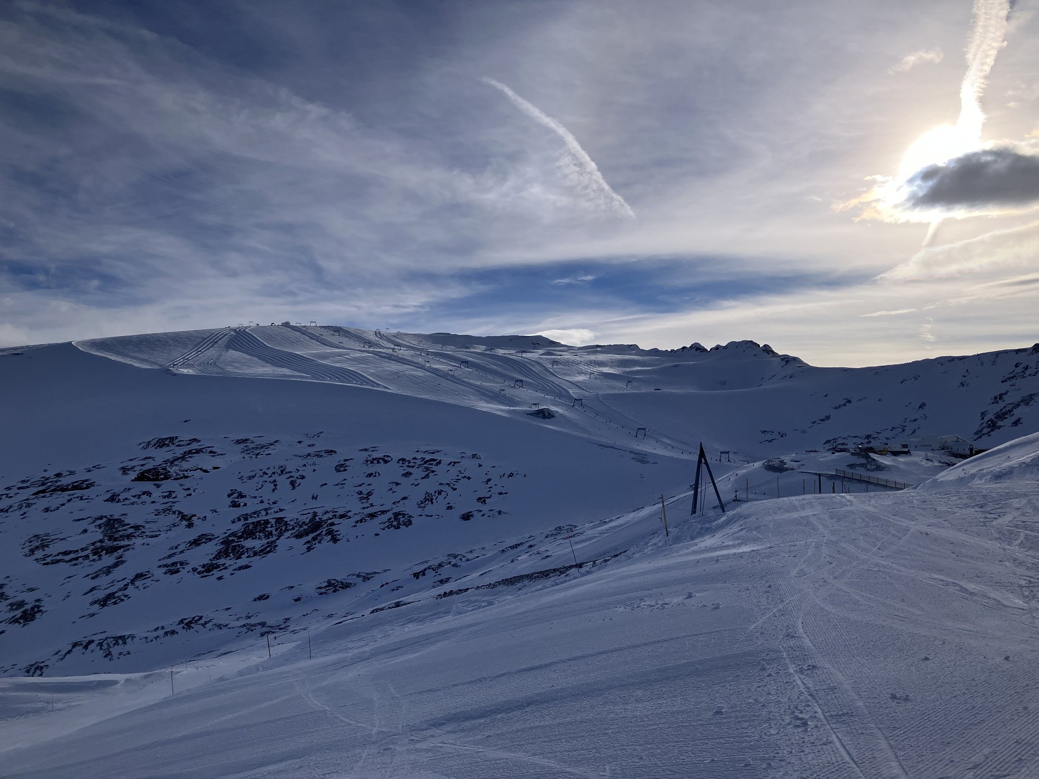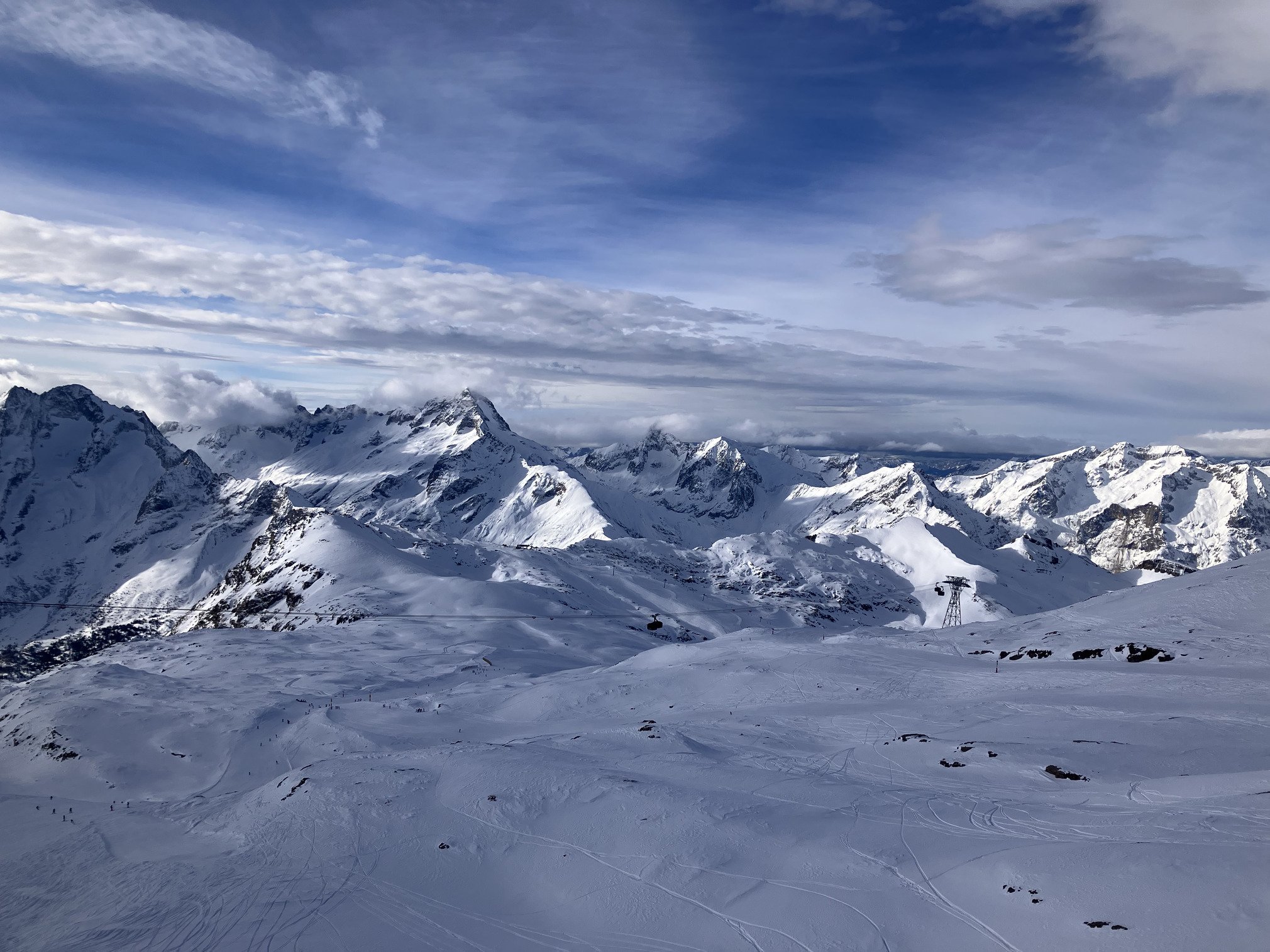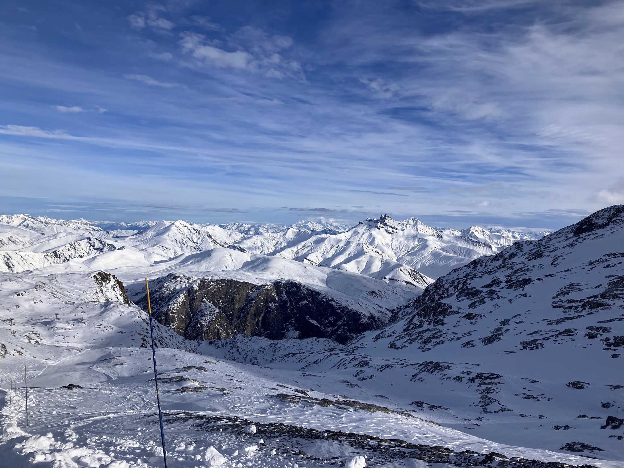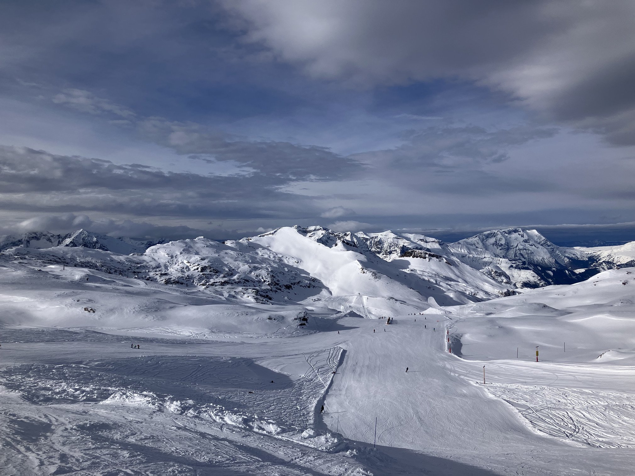 A 13h la visibilité baisse avec l arrivée des nuages. Avant de rentrer, un dernier tour à Pierre Grosse . Il n y a personne. Il est bien annoncé qu il y a des cailloux. Il n’y a personne, pour ne pas avoir à pousser sur la fin, shuss. Fatale erreur 😱🫣.