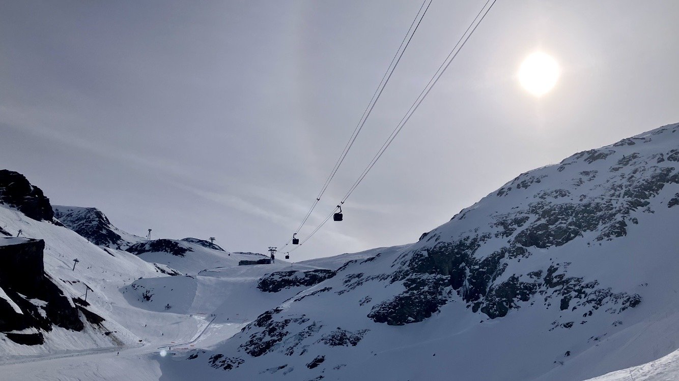 On bascule de lâautre cĂŽtĂ©. MalgrĂ© la mauvaise heure, c est fluide aujourdâhui, normal c est samedi. JâĂ©vite le Jandri pour monter, je prĂ©fĂšre profiter du panorama sur les chemins de traverses avec la gamine. Donc Belle-Etoile, les crĂȘtes et Bellecombe pour filer sur Pierre-Grosse. La piste bleue des gours est Nickel, ça carve, puis shuss sur le mur qui est tout lisse, histoire de ne pas mettre un coup de bĂąton Ă lâarrivĂ©e.