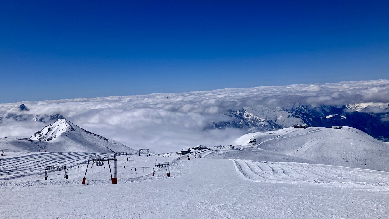 De Puy-Salié au Signal, ça carve. Descente par les écrins vers la Toura. Les paysages sont top avec la ligne de nuages qui fait disparaître la piste!