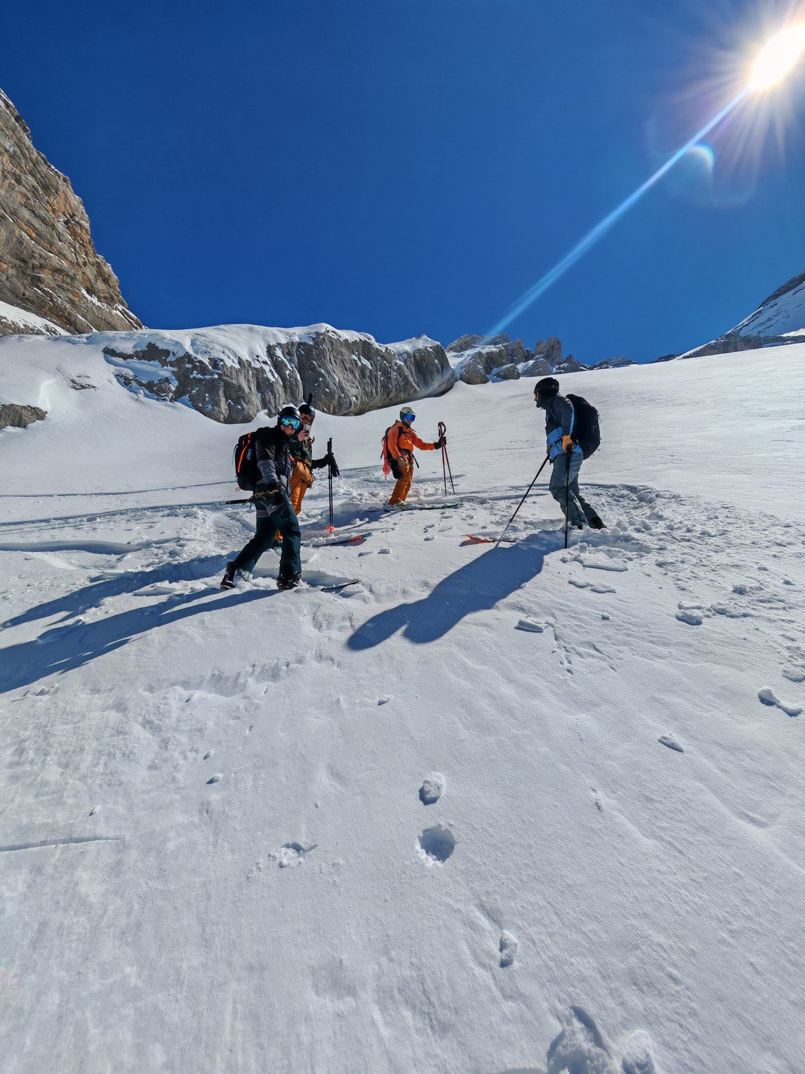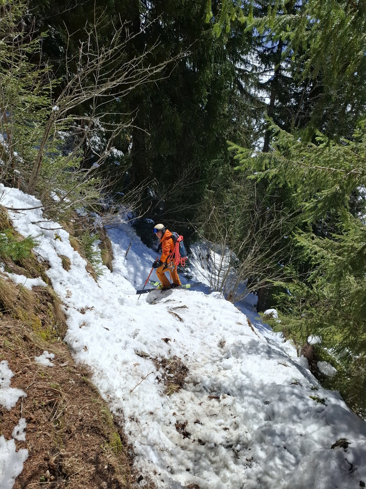 Au milieu de la descente, deux personnes de notre groupe décollent en parapente. Puis on finit à trois en mode border cross, avec une neige de printemps sur la fin.