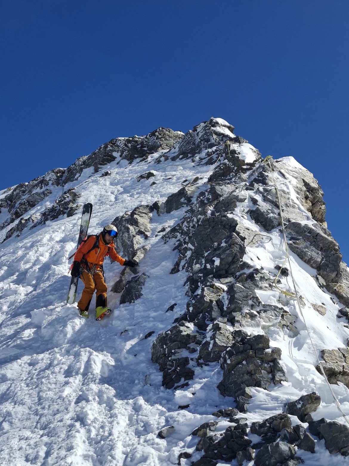 On passe par un des couloirs et, bonne surprise, la neige n’est pas si mauvaise, mais quand même travaillée par le vent. Les Head s’en sortent très bien (bon, ce n’est pas le même genre de sensations qu’avec 115 au patin, mais c’est fun).