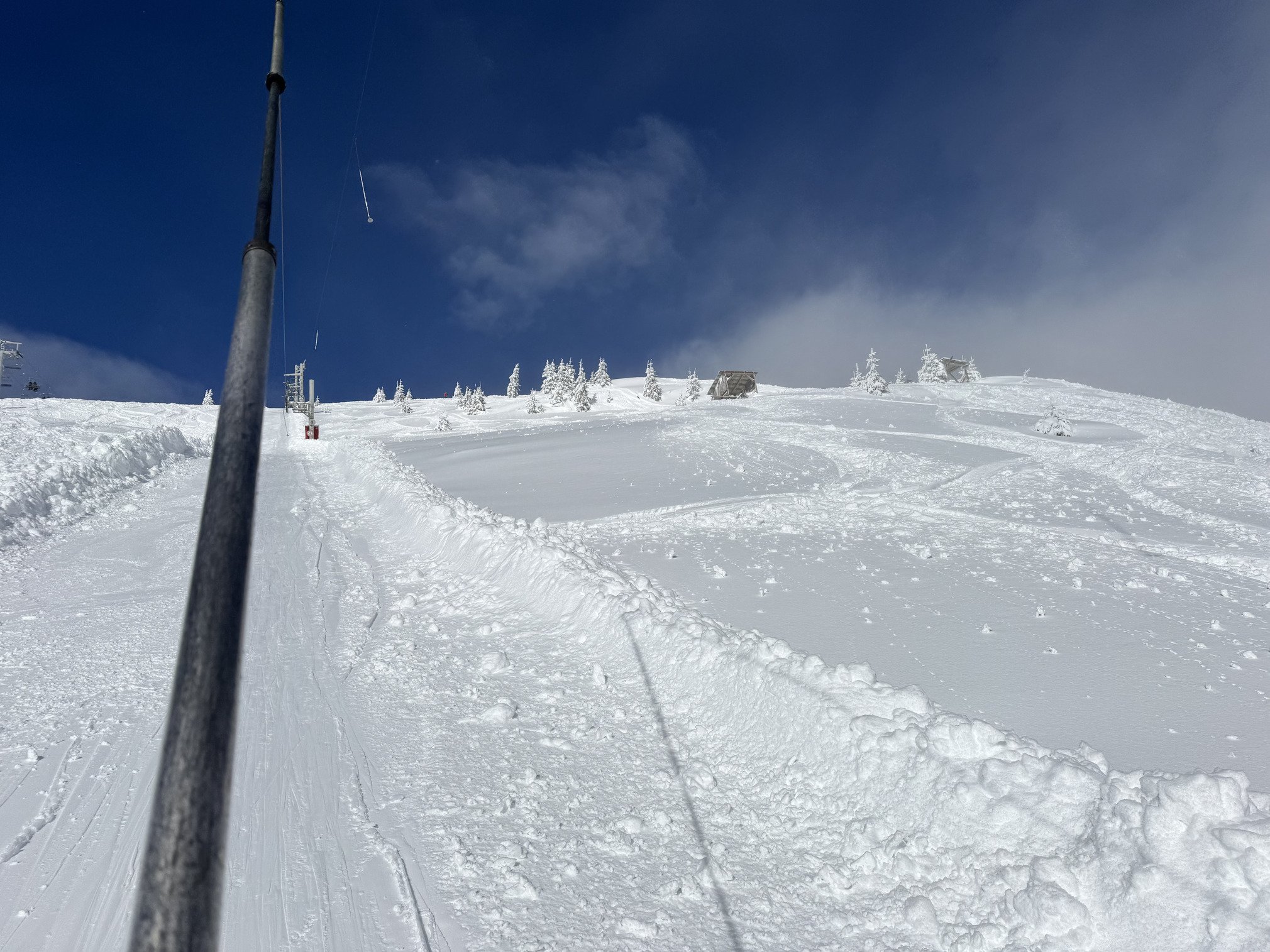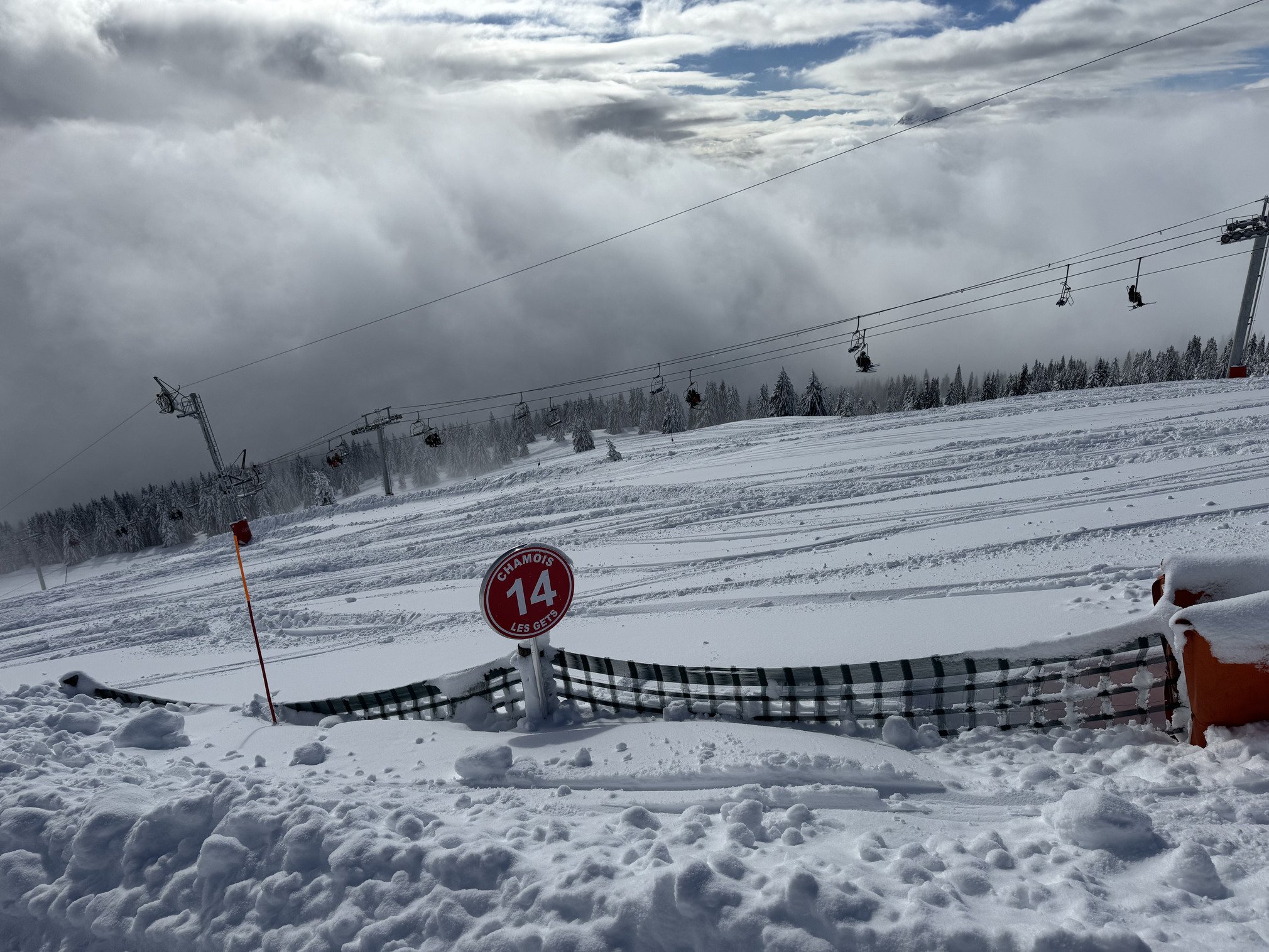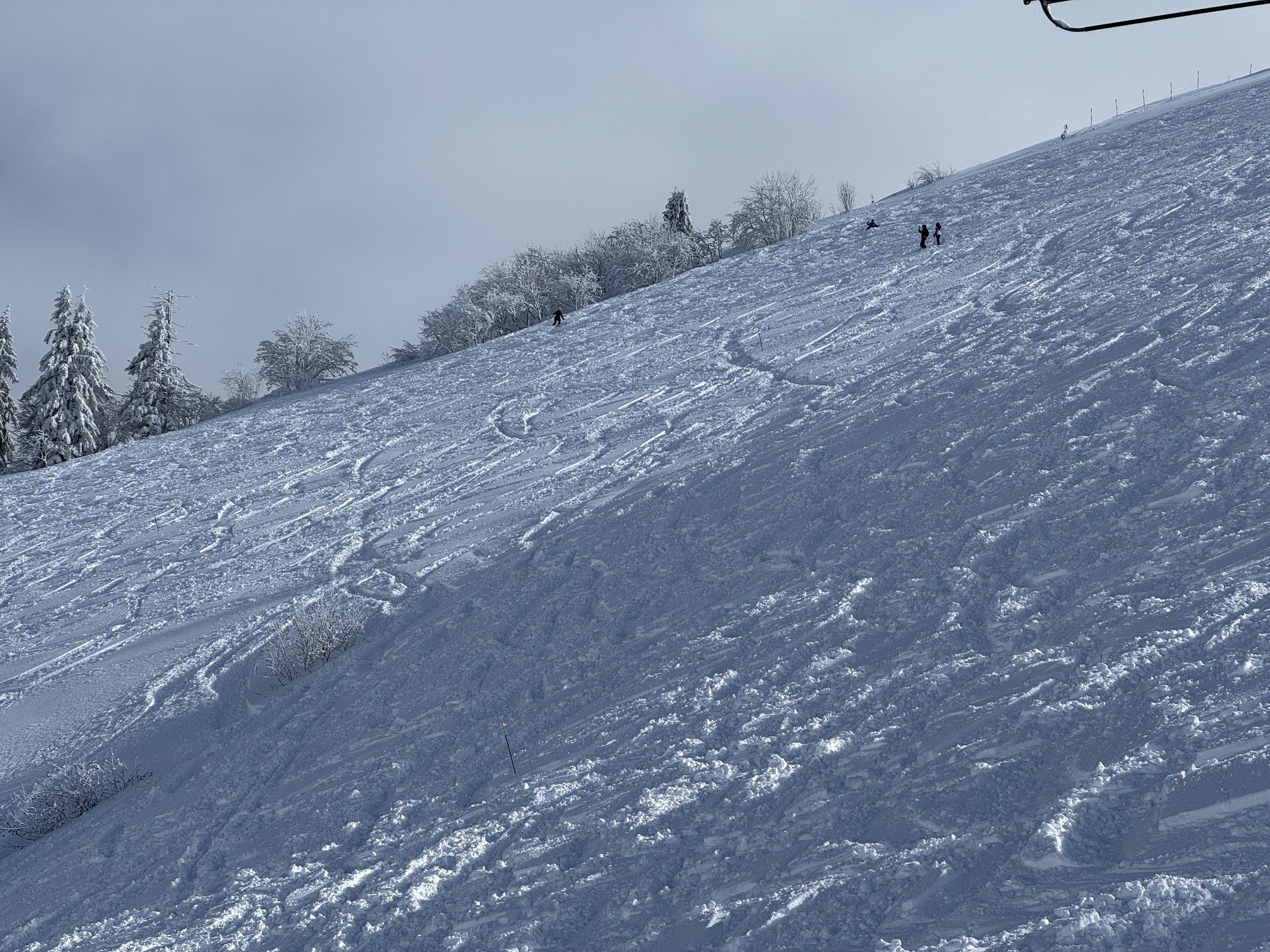 Elle a fait plaisir cette éclaircie, avec de bonnes traces à faire au Mont Cherry. 20 cm tombés dans la nuit , mais lourd jusqu’au sommet et humide en bas des pistes.