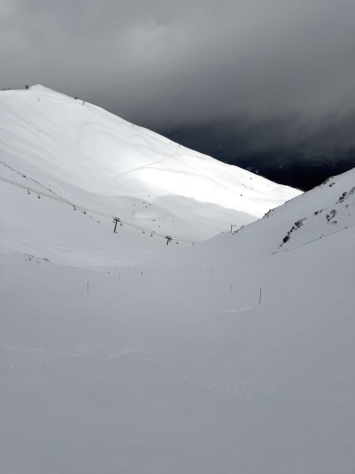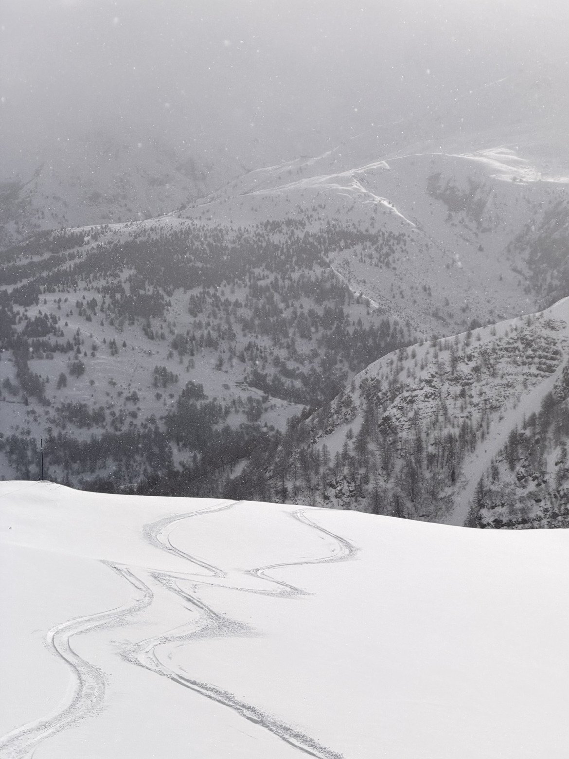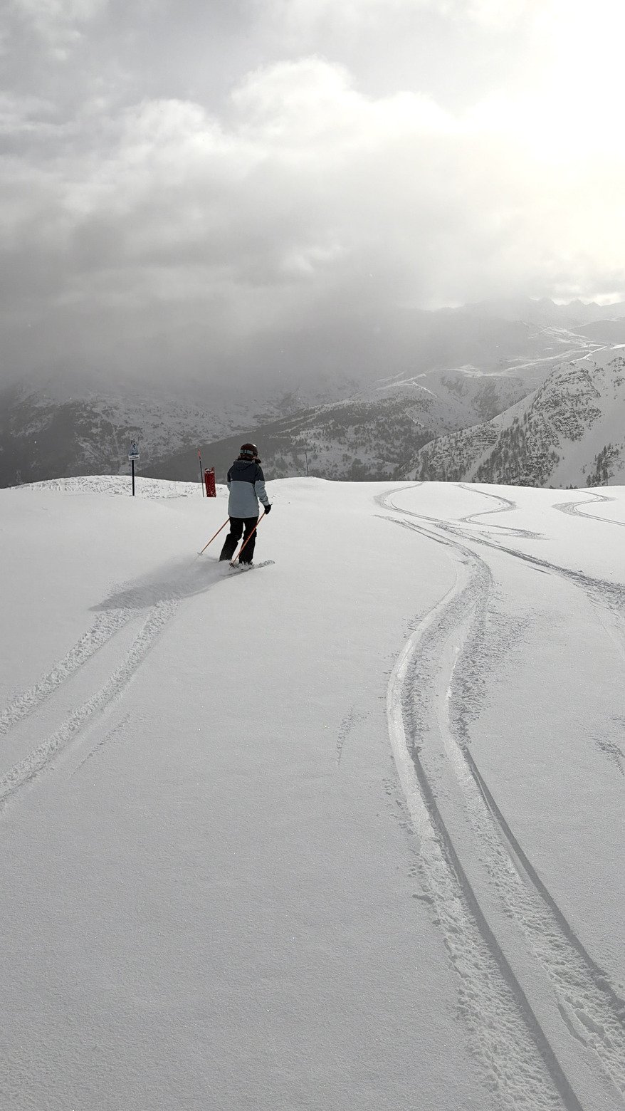 Rapidement, le ciel se couvre, la visibilité tombe à presque zéro avec de la neige, mais ça ne gâche rien : les pistes désertes (genre Chamois / Vordaches) sont un vrai régal.