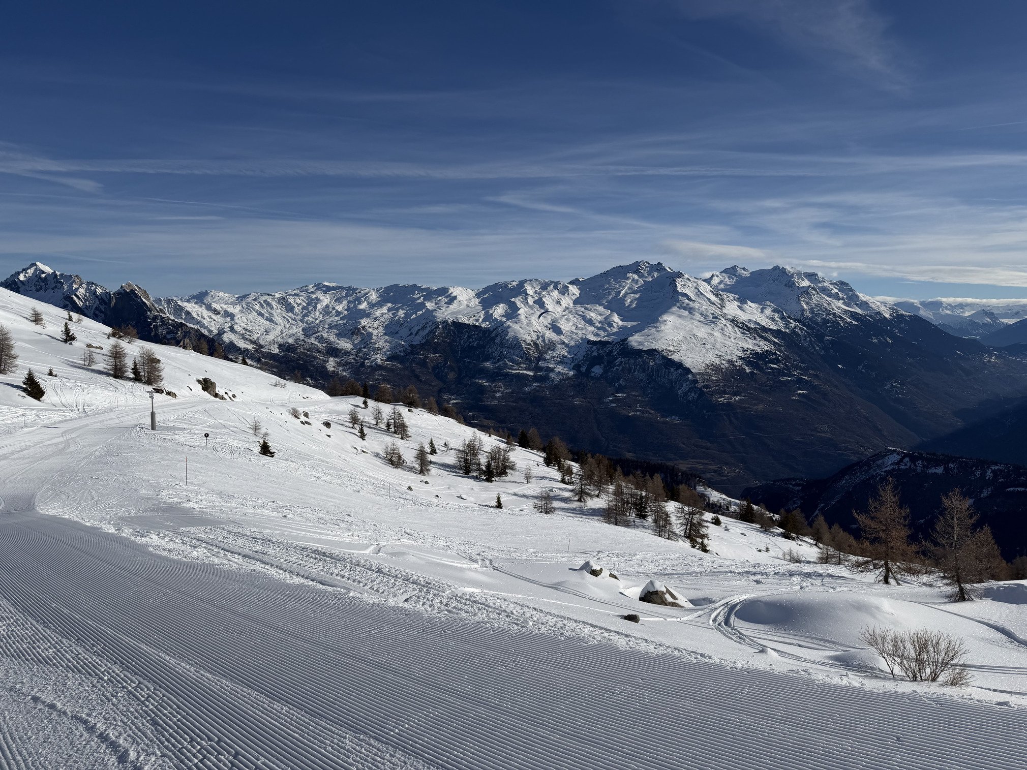 Une neige excellente, des pistes préparées aux petits oignons, un grand ciel bleu et pas grand monde dans la station : c’est parfait.