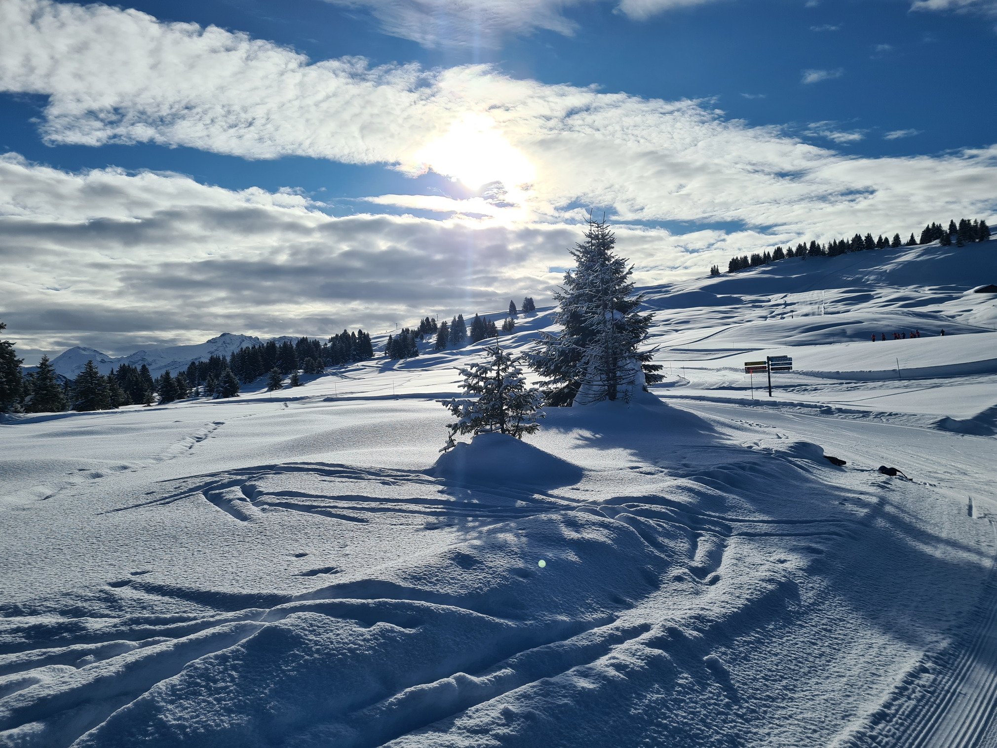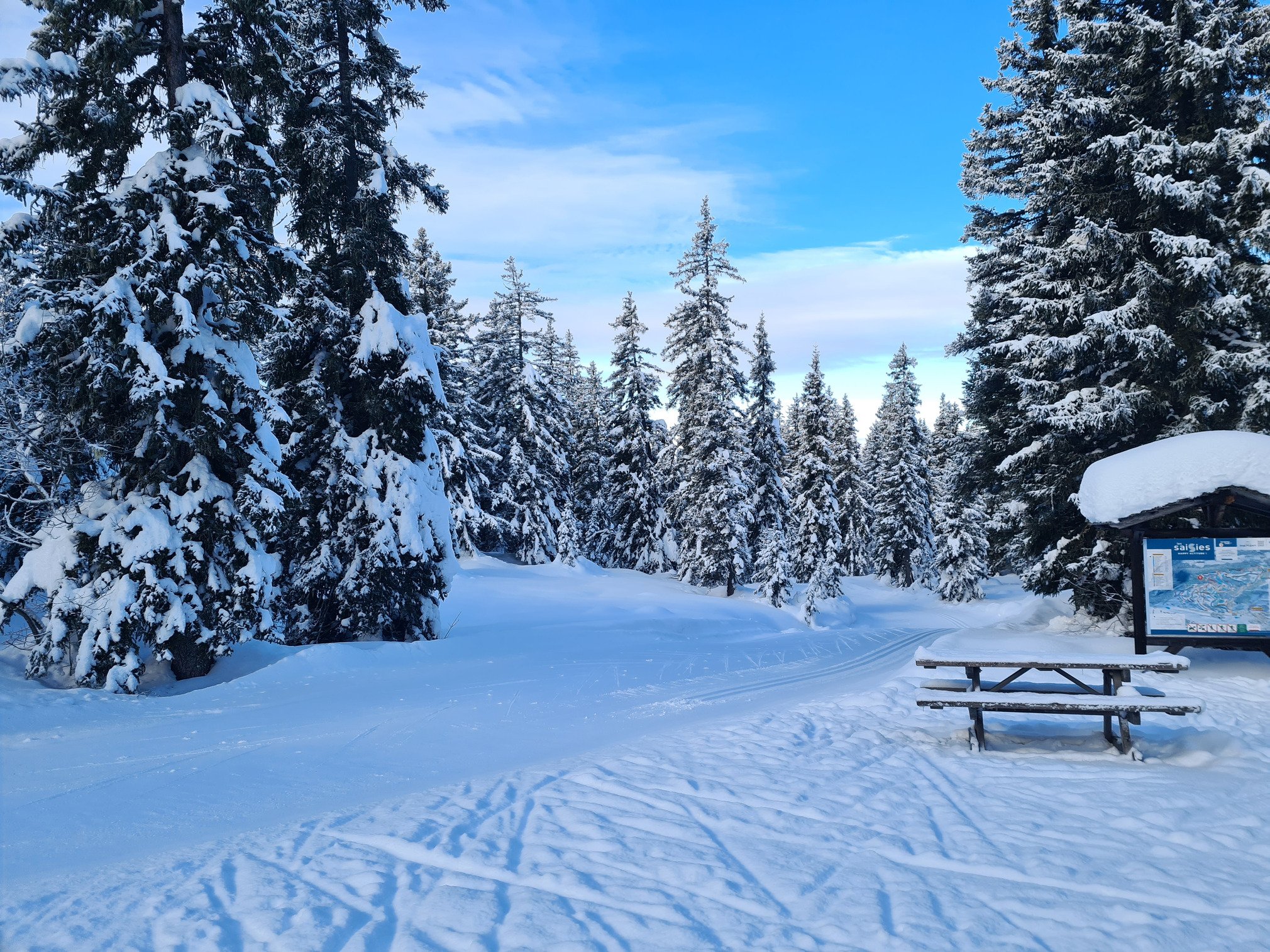 Il a plu puis reneigé la nuit dernière. Bien frais au parking avec une petite couche de neige bien froide. Pistes en état impeccable, neige bien tassée et douce.