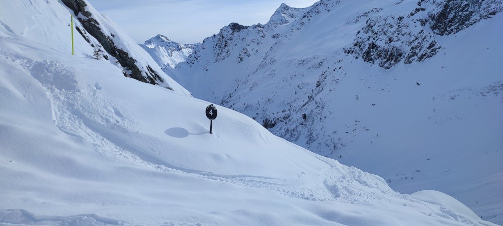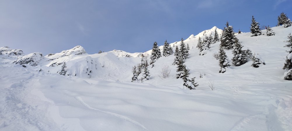 Je pique vers la noire l'Evêque avec encore quelques traces disponibles en laissant la piste à droite pour finir sur les Vallons.