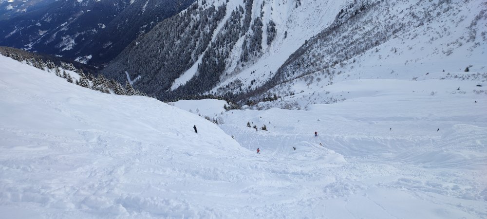 Je file sur Roche Noire en jetant un œil sur le côté pour confirmer qu'Oursière est pas encore ouvert. La neige est excellente et je passe sous le siège de Aigle pour voir. C'est ultra tracé, ça secoue un peu mais la neige est encore bonne.