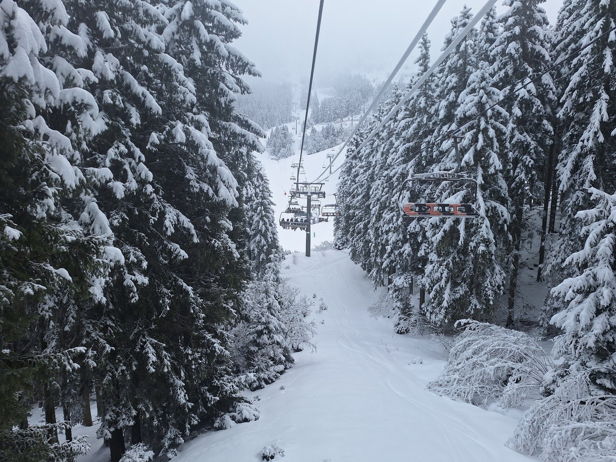 Les gros filets sont installés au sommet de l'Oursiere, impossible d'accéder au Pas du chien et la piste bleu . Ca sera pour demain. Y'a de quoi faire sous ce télésiège, plan du praz jusqu'en bas. Miam!