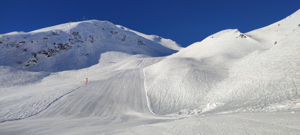 Une fois en haut, je descends vite sur Oursière où j’arrive à faire la première « trace » sur le damage des ratraks. C’est dur mais pas glacé. Je monte au siège éponyme pour faire le mur de la rouge à droite de l’arrivée encore vierge de toutes bosses et à la neige extra douce…