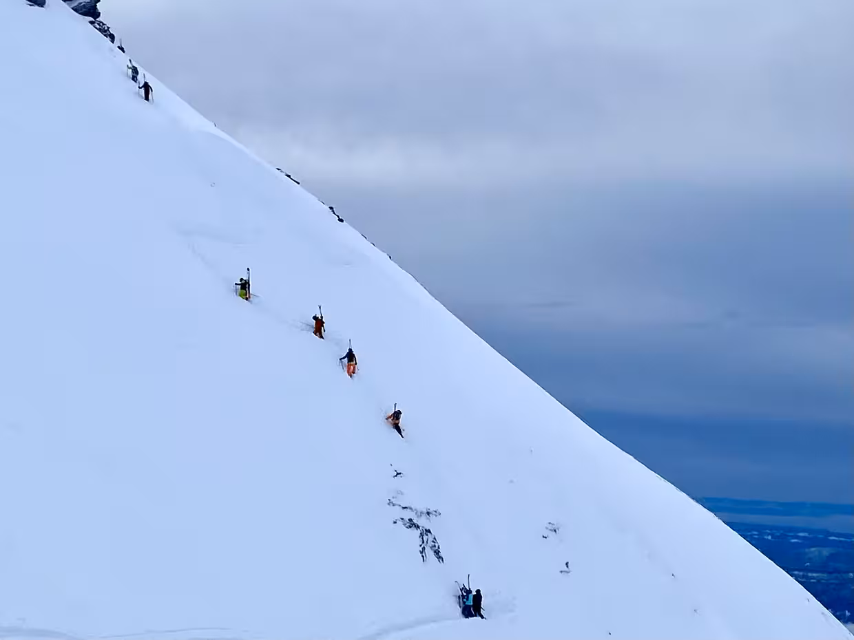 C’est finalement sur notre dernière montée au Col de Pouta que nous voyons un groupe encadré de 2 guides ESI, faire les marches d’accès à la partie supérieure des Vallons de Bedina. Nous décidons d’aller voir cela de plus prêt. L’accès à l’arête n’est pas aisé mais le guide en tête aura sacrément bien fait le boulot, nous profitons de ces belles marches pour réaliser en fin d’après-midi, ce qui restera notre meilleure ride de la journée dans ce fond de combe restée bien vierge si l’on oublie les quelques randonneurs venus profiter du seul coin safe et paisible du domaine !