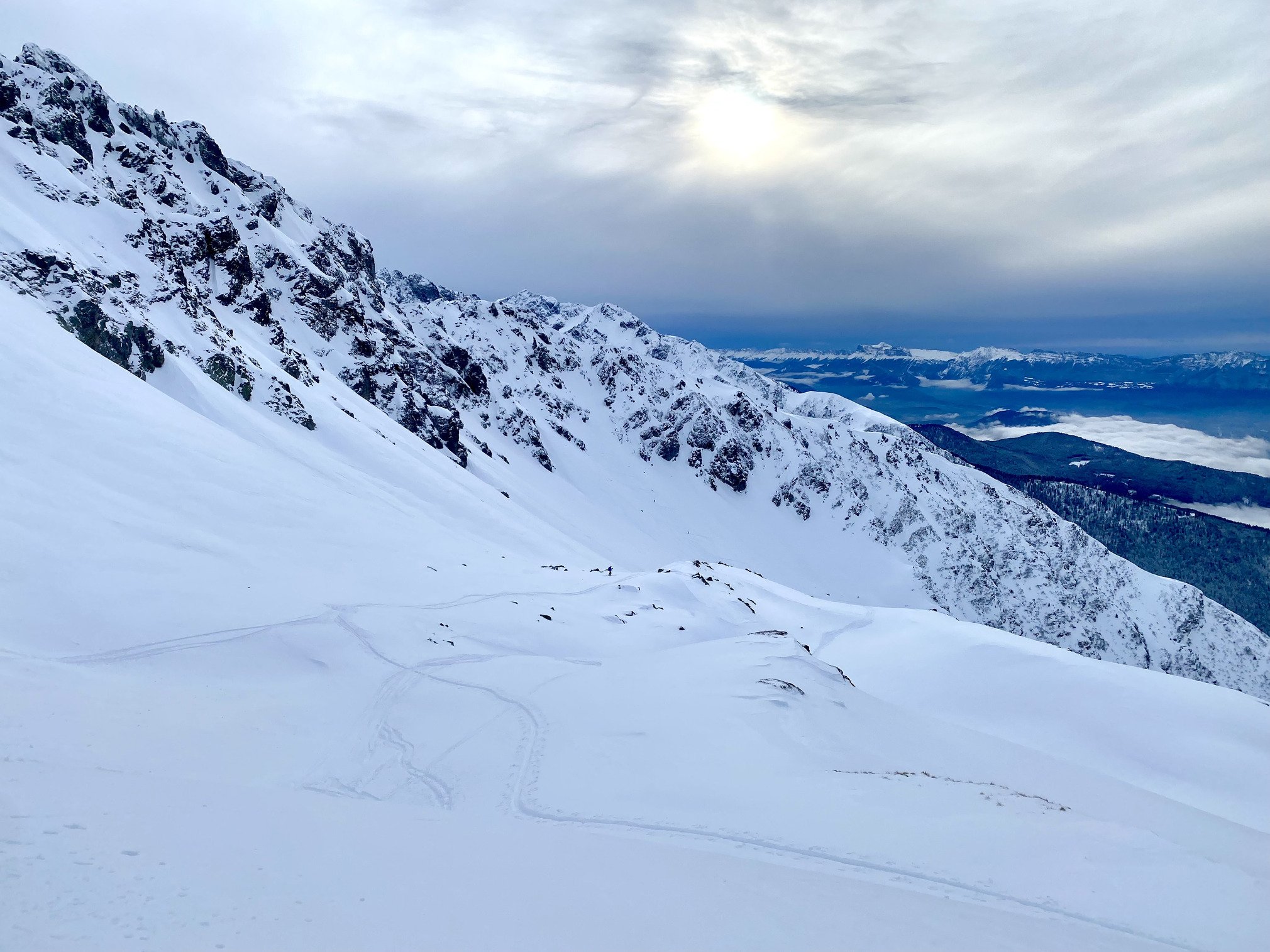 Neige fraîche froide et rapide en face nord, parfois plus matée sur d’autres expositions…La stabilité nivologique reste bien aléatoire et d’autant plus piégeuse que les soucis majeurs (plaque à vents bien insidieuses) sont apparus quelques jours avant cette dernière chute…