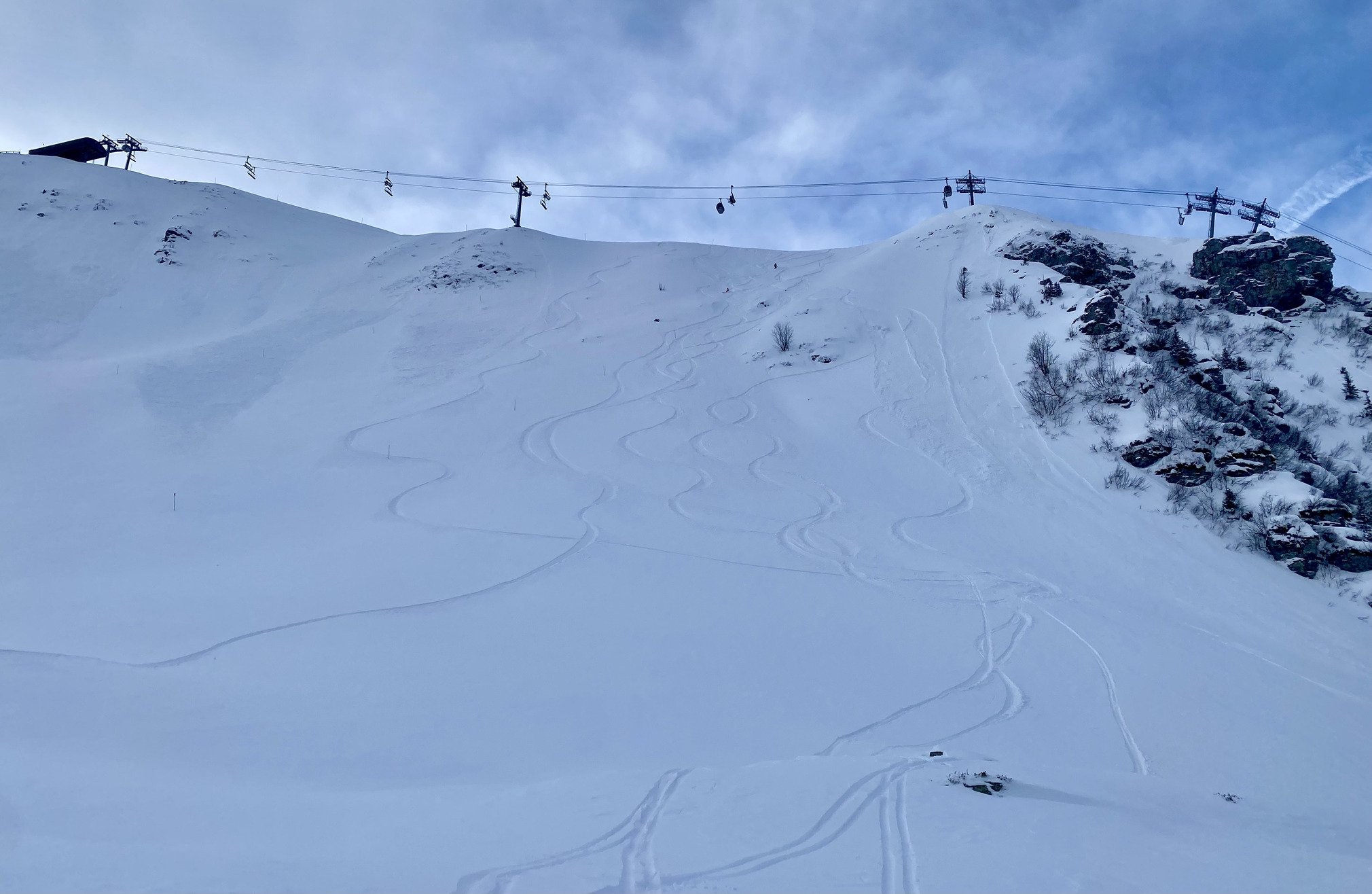 Nous aurons finalement bien profité des lignes secondaires, notamment jusqu’à 11h avant que l’affluence devienne vraiment impressionnante au départ de Pipay ( Antenne Ouest, Pra par l’Oursière, Jasse par la main courante et quelques très bons runs coté Oudis et pentes du Grand-cerf).